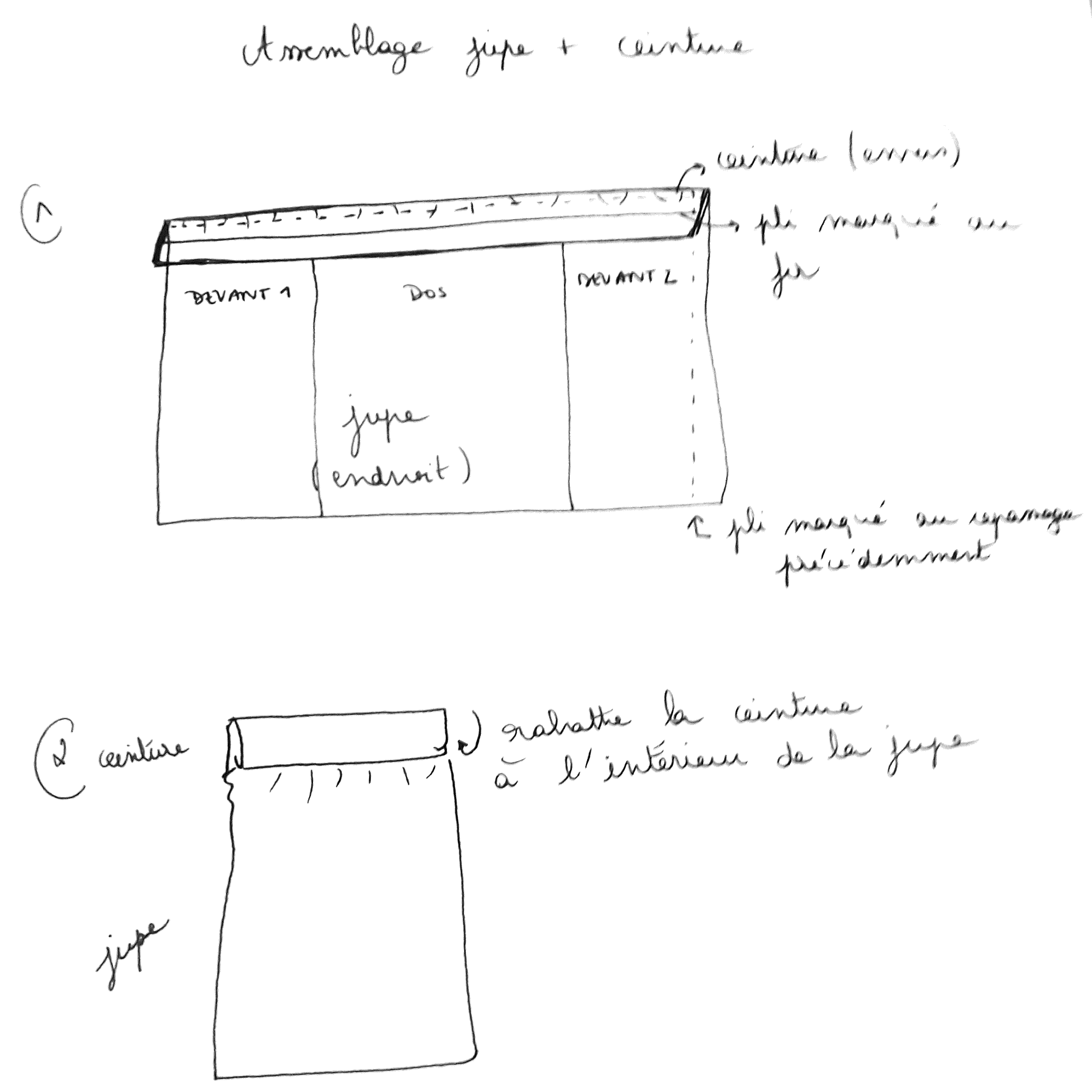 - Assembler la jupe froncée à la ceinture, en les cousant endroit contre endroit comme sur le schéma ci-dessous: