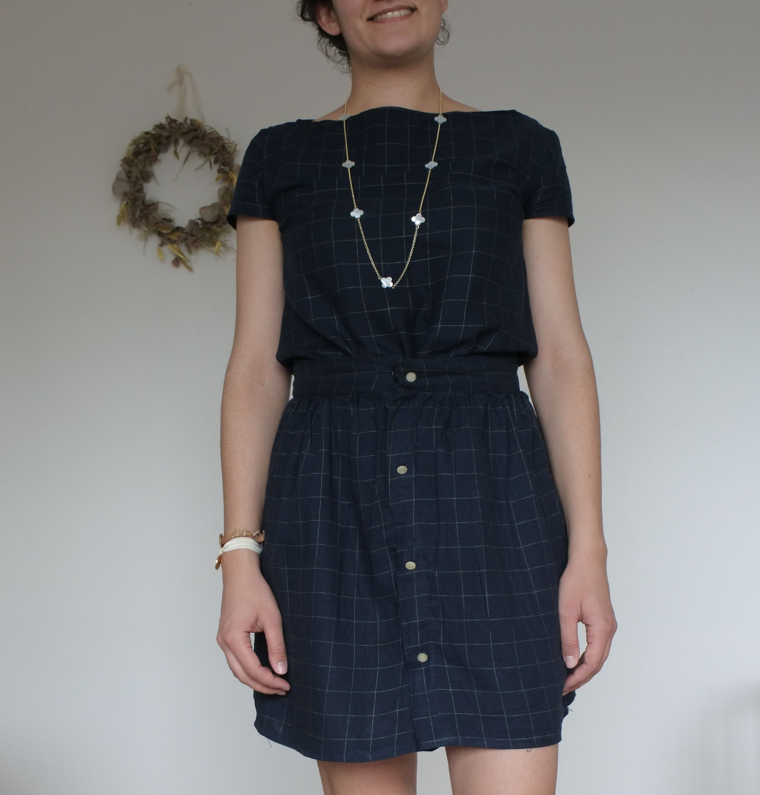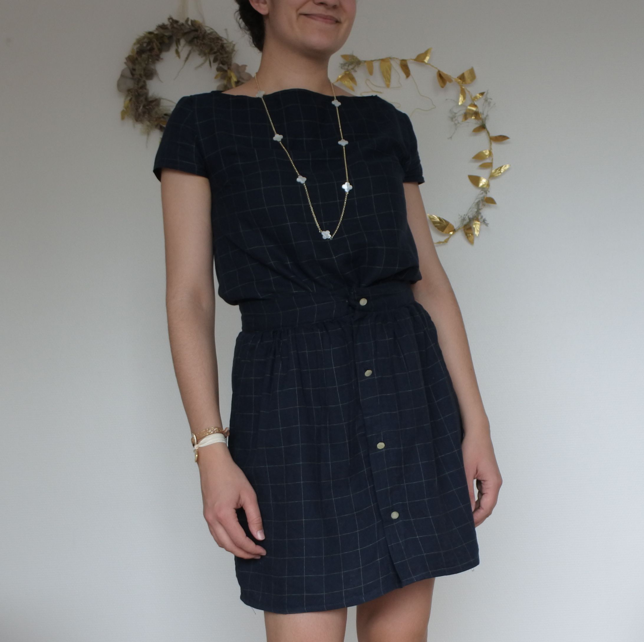 - Fixer les boutons de pression sur les devants de la jupe (nombre et espacement à votre convenance, mais il en faut au moins 1 au niveau de la ceinture. De mon côté j’en ai posé 2 pour s’assurer que la jupe ne s’ouvre pas sur cette zone plus tendue!)