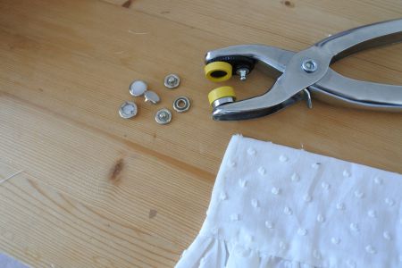 - Pour ma part, j’utilise une pince, avec des boutons pression de Mondial Tissu, très simples à poser!