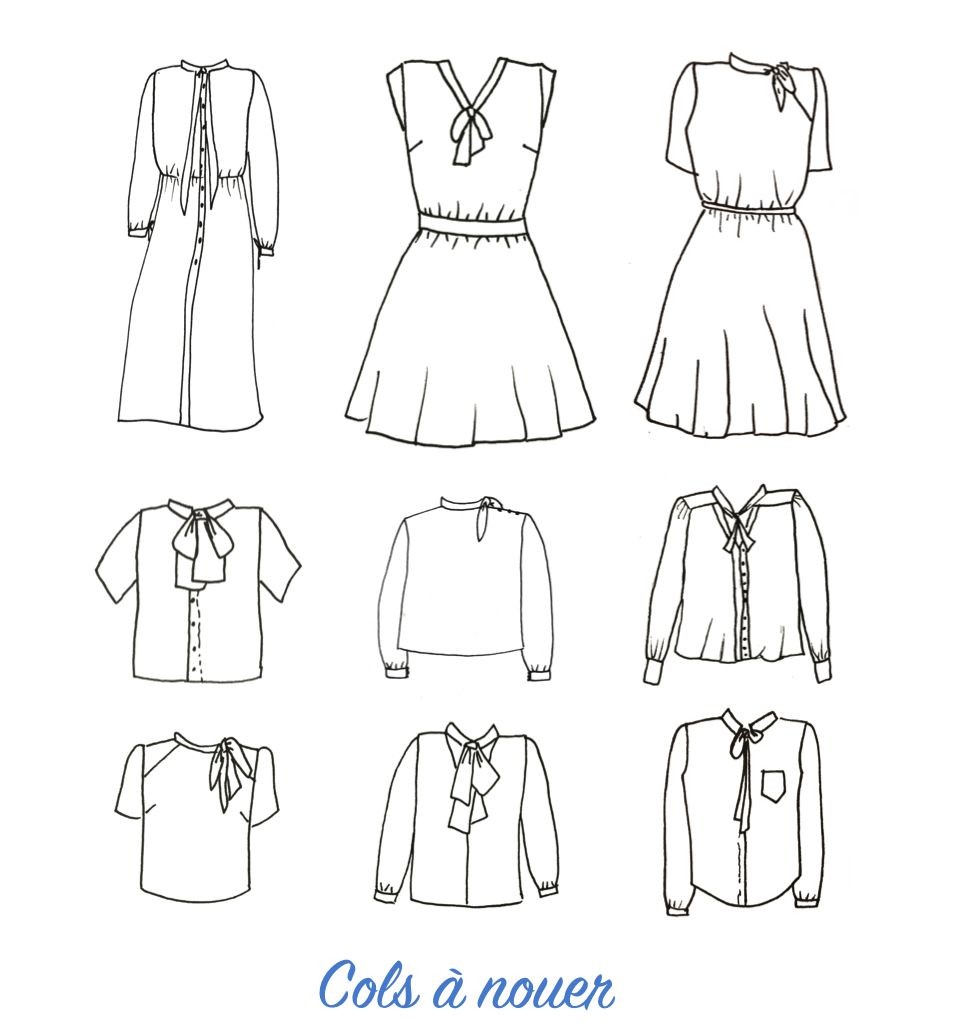 Je n’ai pas trouvé beaucoup de patrons proposant ce type de détails, aussi je vous ai ajouté les patrons dont le col se noue sur le côté!