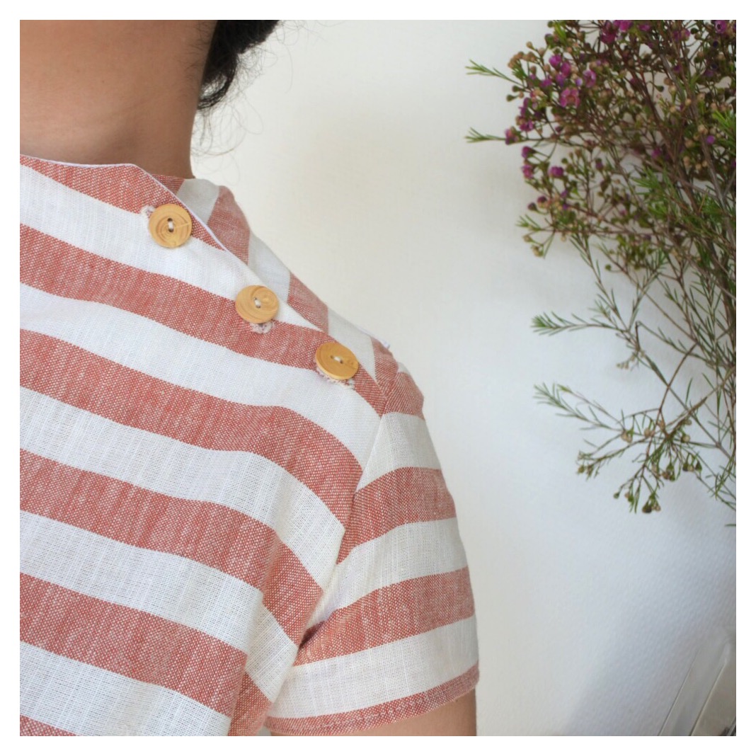 A l’origine de ce tilt : les proportions remarquables de cette blouse tee-shirt : la longueur de manches parfaite, l’effet légèrement blousant, et la rangée de boutons sur le côté qui me rappelaient ce fameux détail des marinières boutonnées Saint James.
