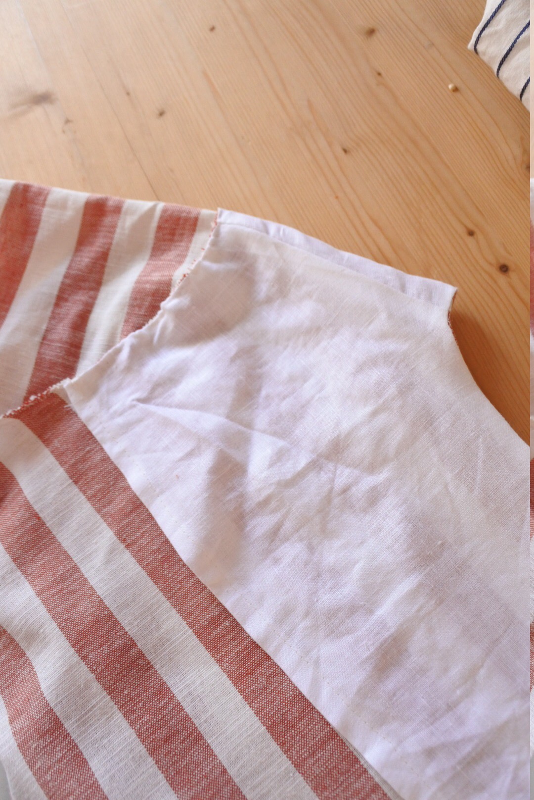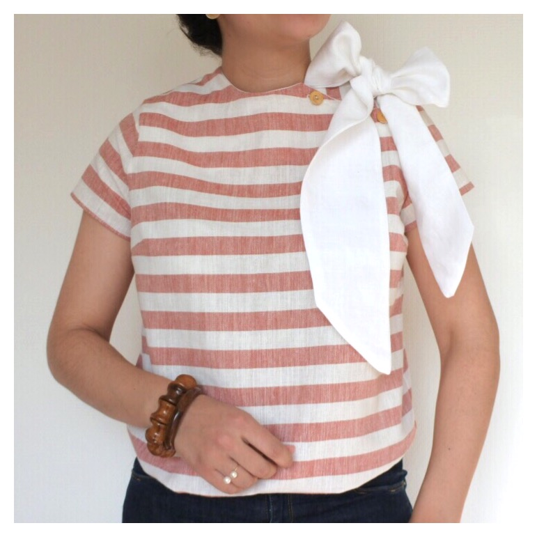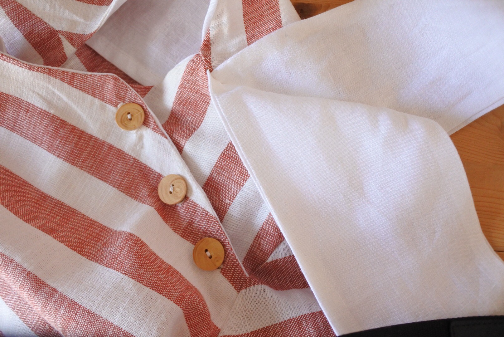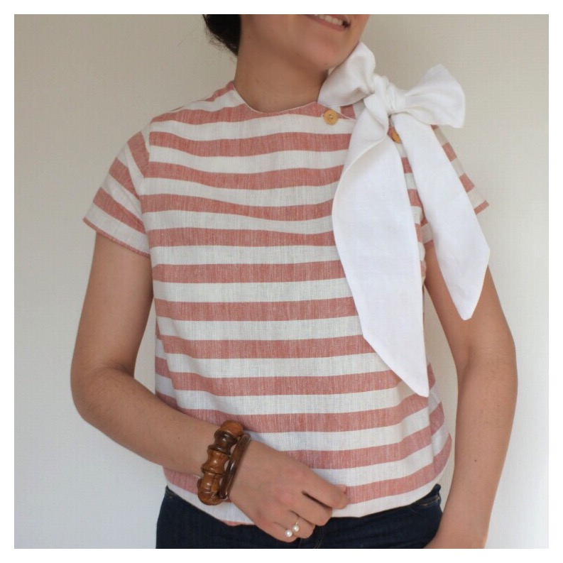J’ai donc utilisé mon fameux coupon de lin rayé , provenant des Coupons de Saint Pierre. Je n’ai fait aucune modification sur le modèle, mis à part la suppression des volants (ce qui m’a aussi permis de consommer moins de tissu) et l’ajout de ce gros noeud, façon Claudie Pierlot, qui lui, m’a permis d’utiliser une chute de lin Coupons de Saint Pierre, qui me restait de l’année dernière!)