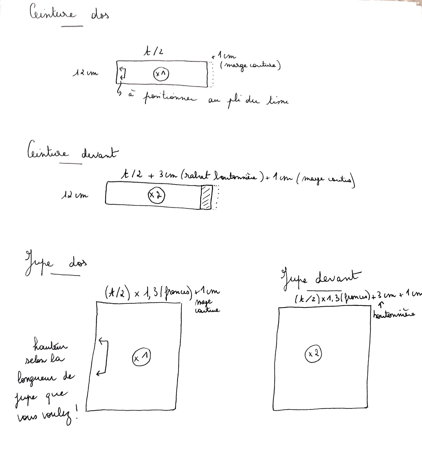 - t: votre tour de taille en cm et h : la longueur de jupe que vous voulez (ne pas oublier de prendre une marge pour l’ourlet!)