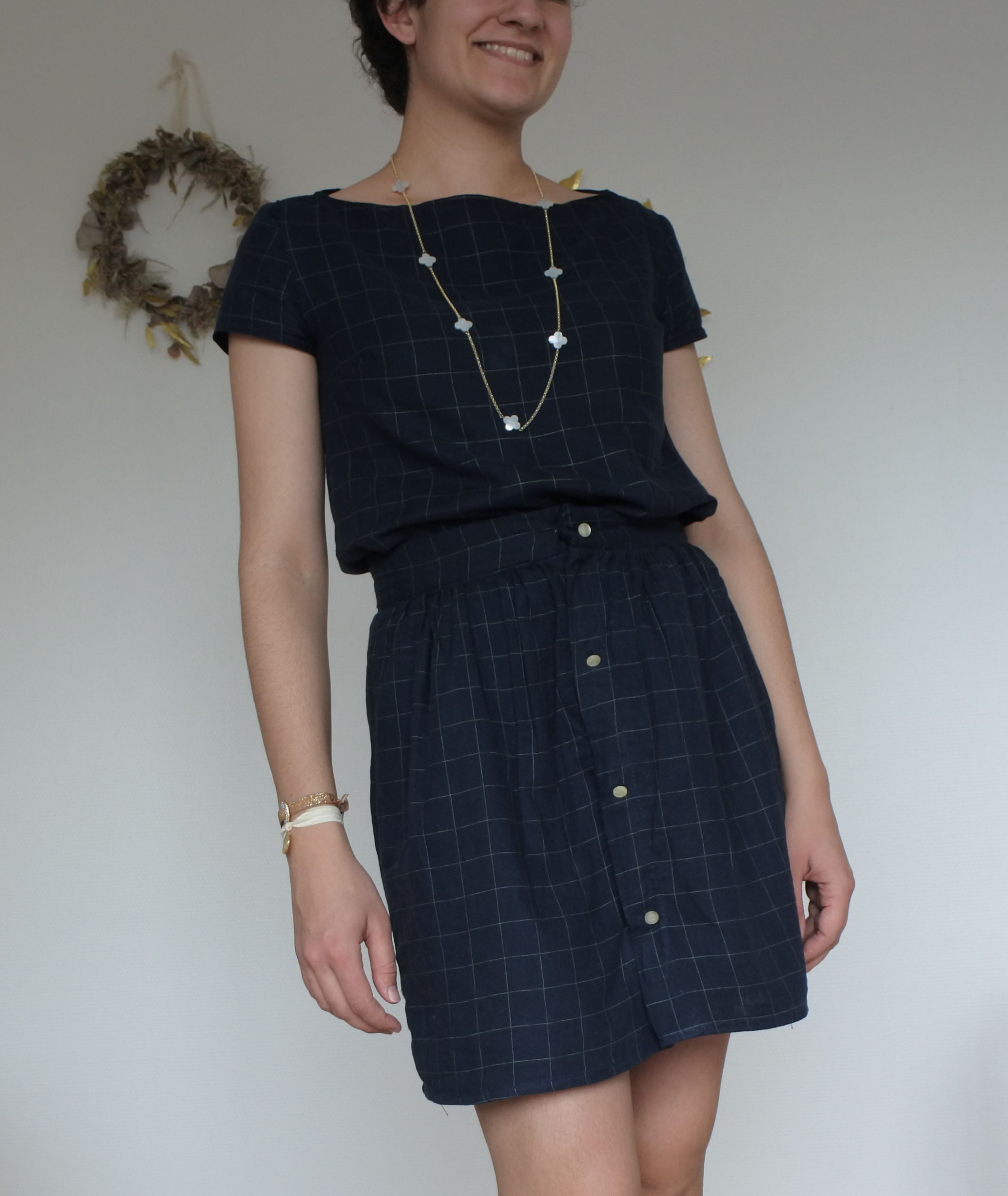 Cette double gaze, hyper mignonne et toute douce m’a donné envie de réaliser une tenue doudou, avec un haut et une jupe coordonnés! L’impression de porter une robe et la possibilité de les porter séparés!