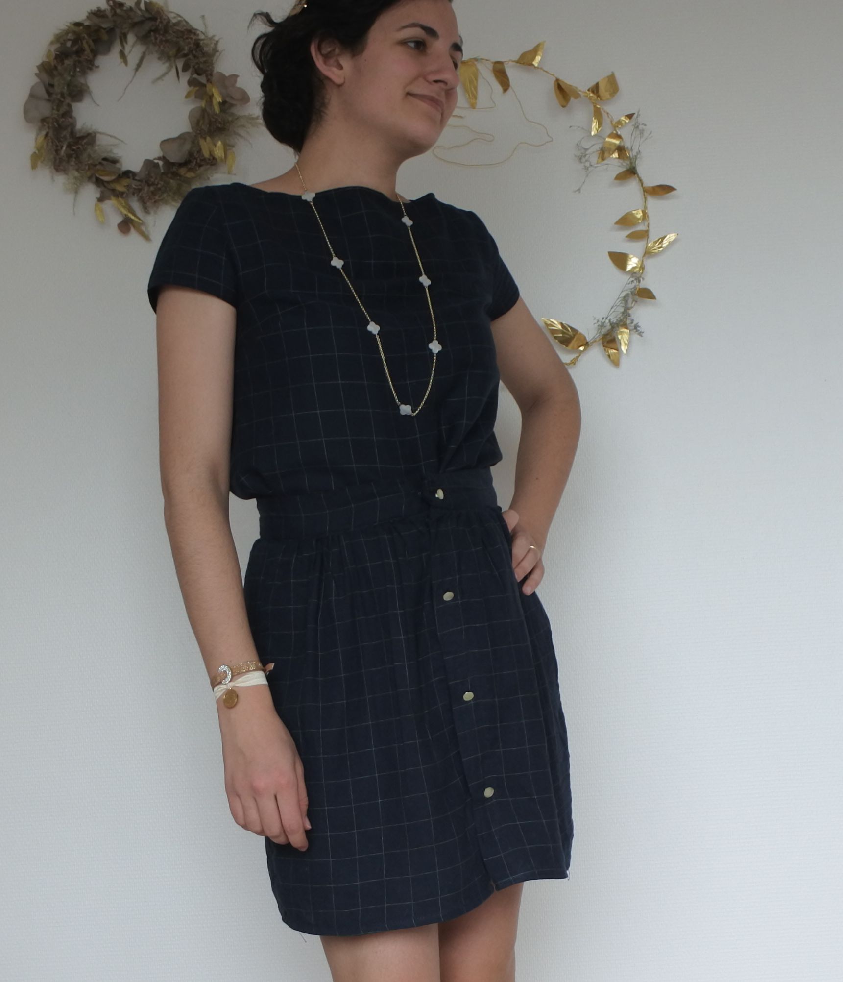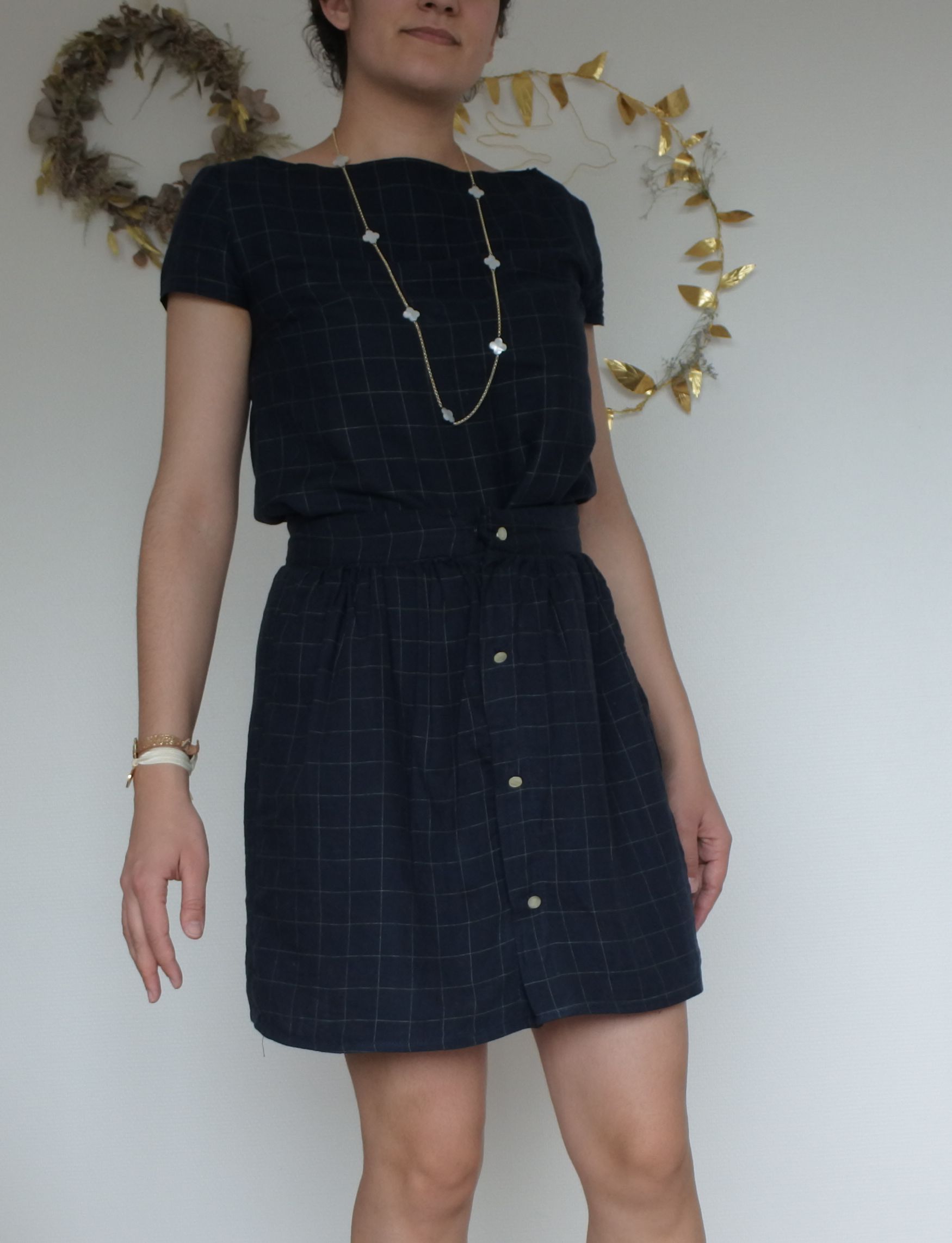 - Fixer les boutons de pression sur les devants de la jupe (nombre et espacement à votre convenance, mais il en faut au moins 1 au niveau de la ceinture. De mon côté j’en ai posé 2 pour s’assurer que la jupe ne s’ouvre pas sur cette zone plus tendue!)