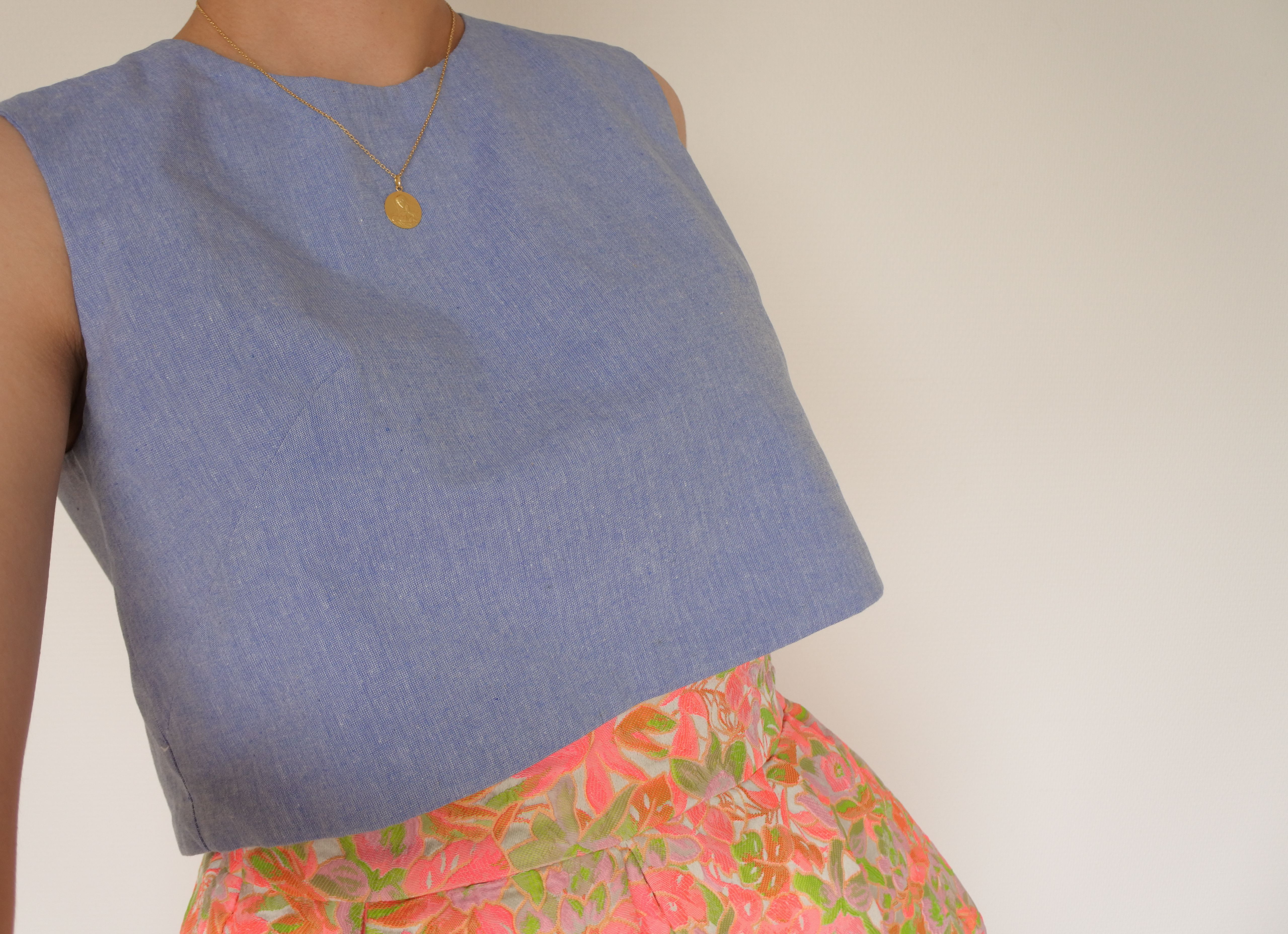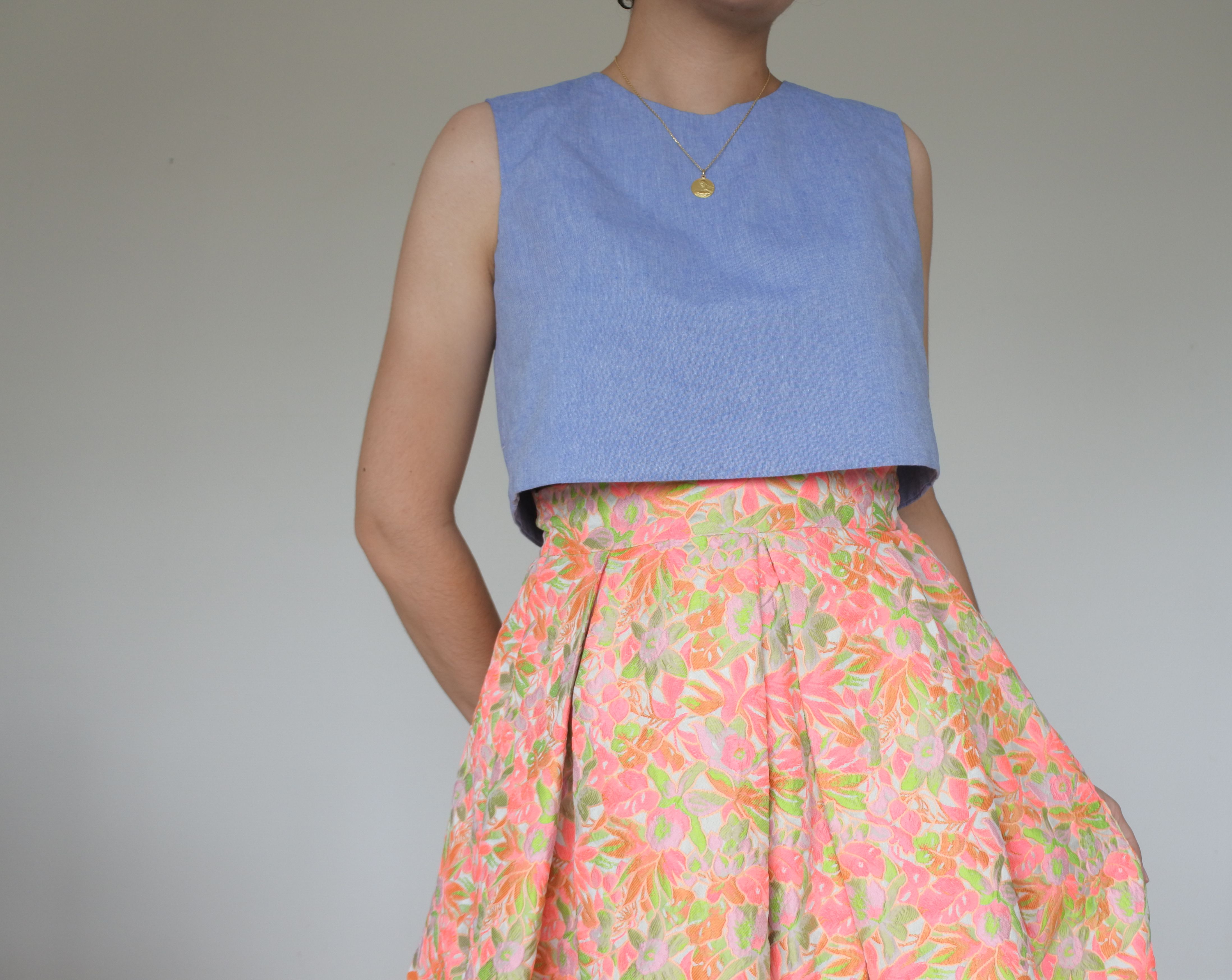Cette pièce se marie bien avec le haut de La Parisienne en Eté, que j’avais cousu l’année dernière (ici). Par rapport au modèle original, je l’avais raccourci pour qu’il aille avec des jupes taille haute, et que la taille soit plus marquée.