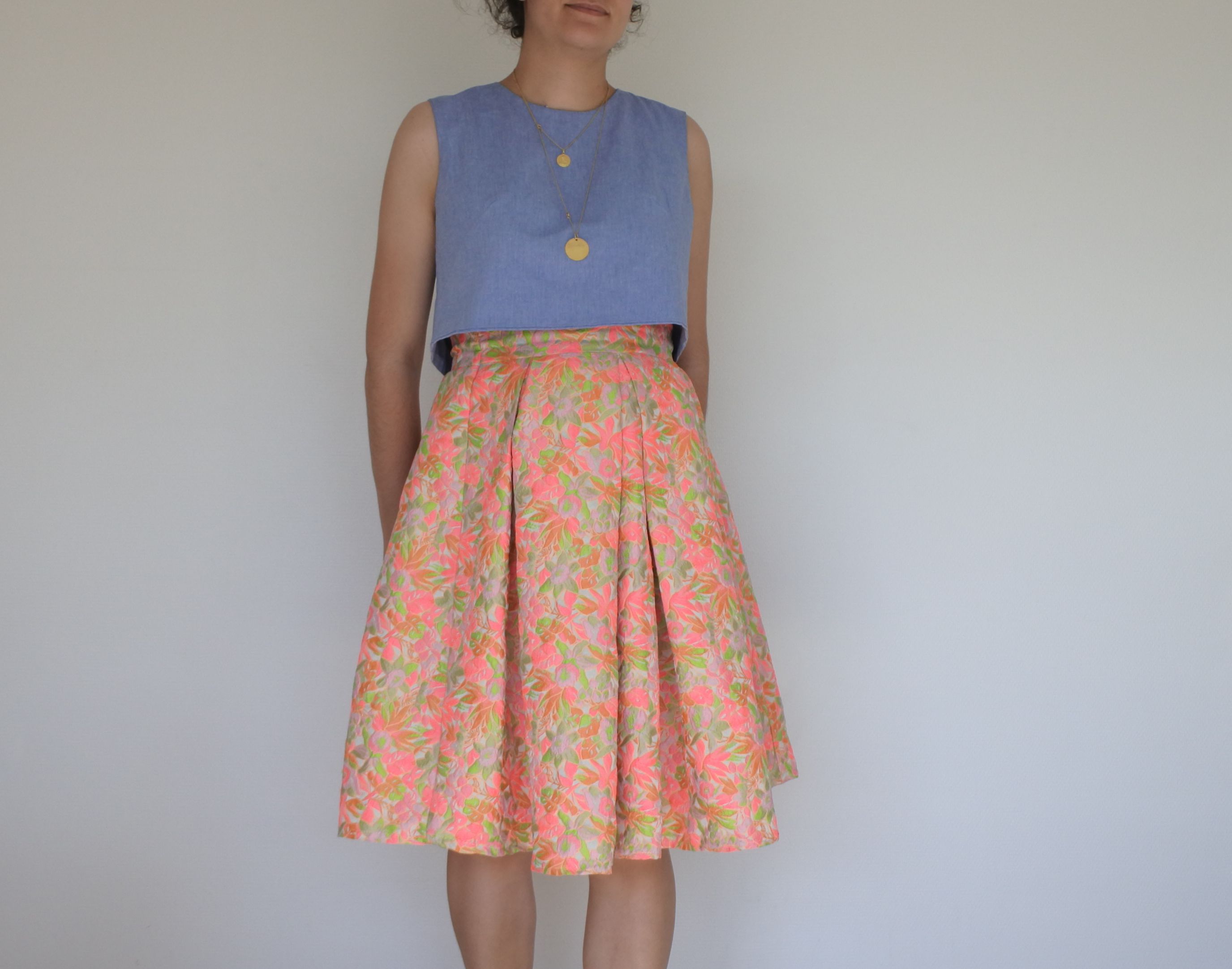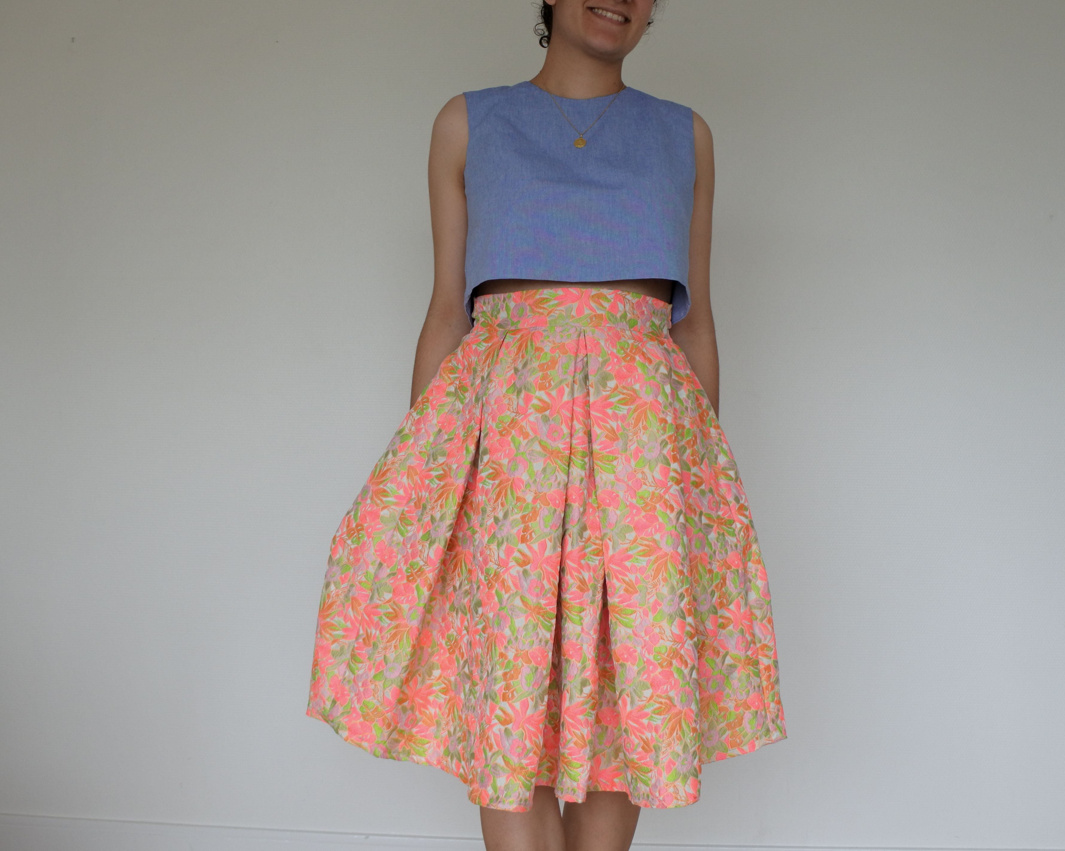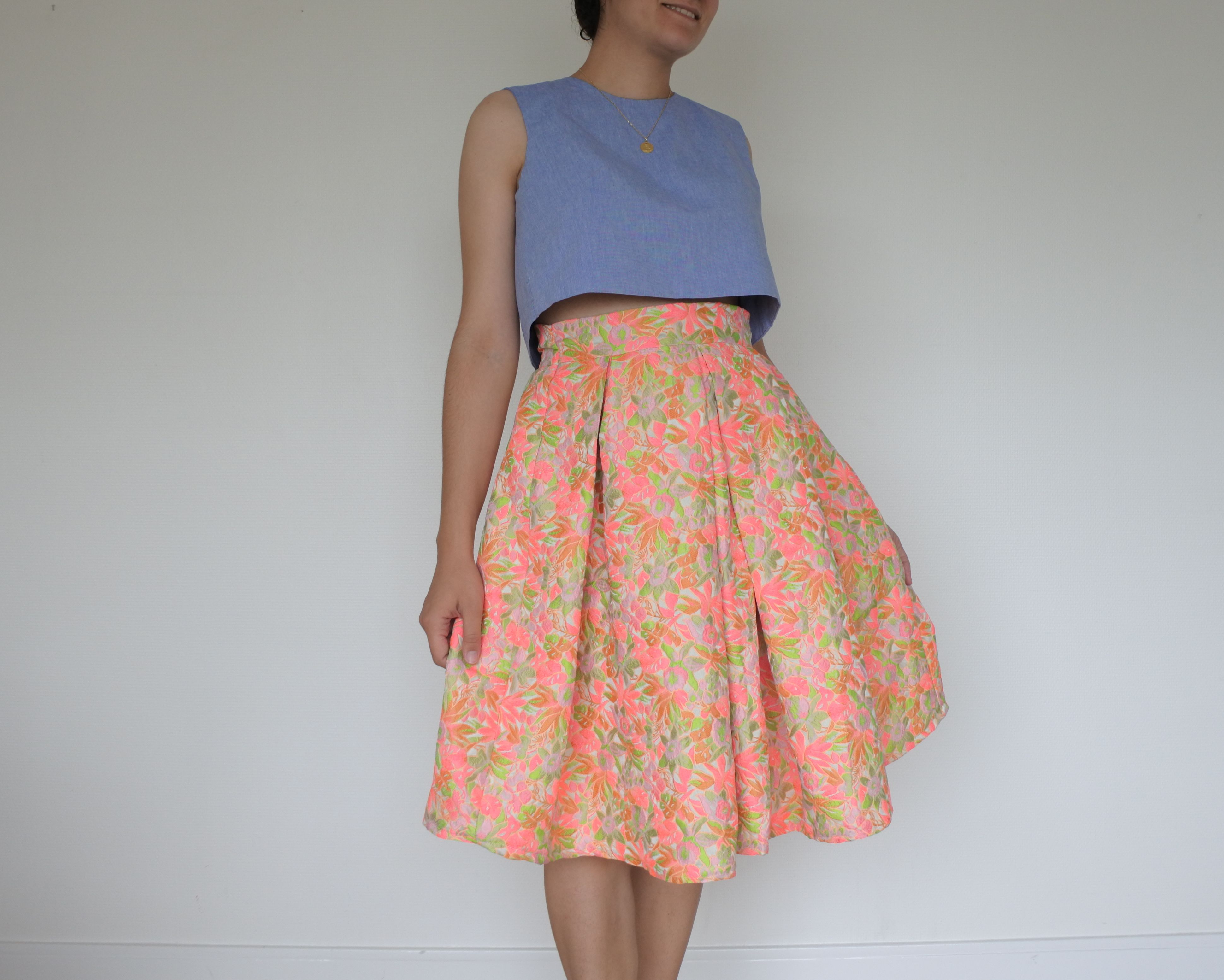 Aujourd’hui, je vous présente une tenue 100% handmade, composée d’une jupe en jacquard Atelier de la Création , dont on m’ a dit qu’il provenait de la maison Givenchy! Et en effet, je suis tombée sous le charme de ces coloris fluos ! Je ne voulais pas abimer ce coupon, j’ai donc réalisé la jupe à partir d’un patron maison, en coupant le moins possible de tissu. De cette manière, la jupe n’est finalement constituée que de rectangles (ceinture et pans devant/dos), et que j’ai modelés à l’aide de grands prix creux. J’ai utilisé toute la largeur du coupon pour ne pas avoir de chute. J’ai ensuite fixé une fermeture éclair dans le dos.