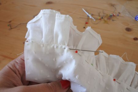 - Repliez sur 1 cm la bordure, et assemblez-la aux froufrous.