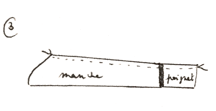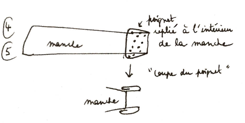 - Si la manche est plus large que le poignet: des fronces/plis pourront être réalisés en bas des manches pour obtenir la même largeur