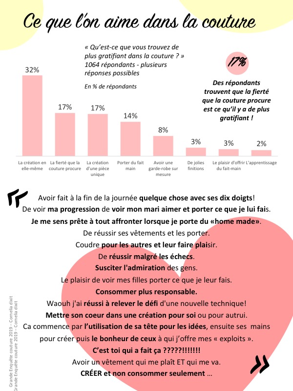 Cette enquête confirme également les ressentis vis à vis de la communauté couture qui s’est constituée sur les réseaux sociaux et qui bousculent les clichés que peut véhiculer ce type de médias ! Une communauté bienveillante, diverse, inspirante , sympathique et de temps en temps trop tentatrice : trop d’idées, étalage de tissus… Certains ont parfois l’impression d’être poussés à la consommation !