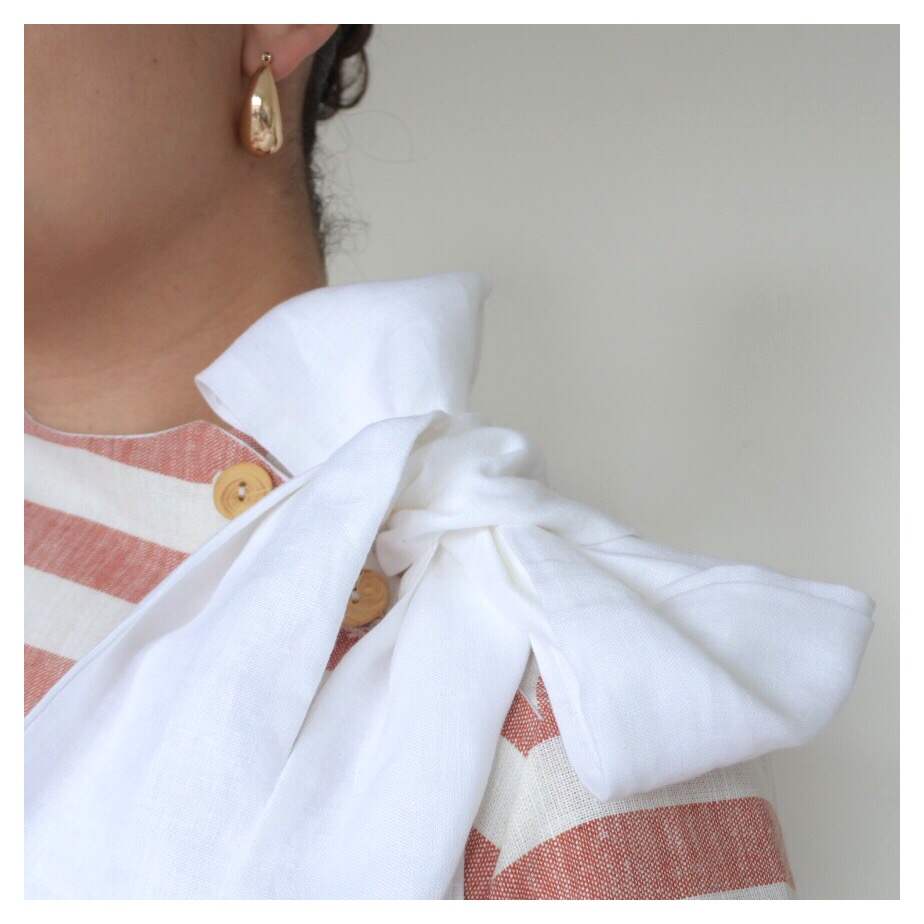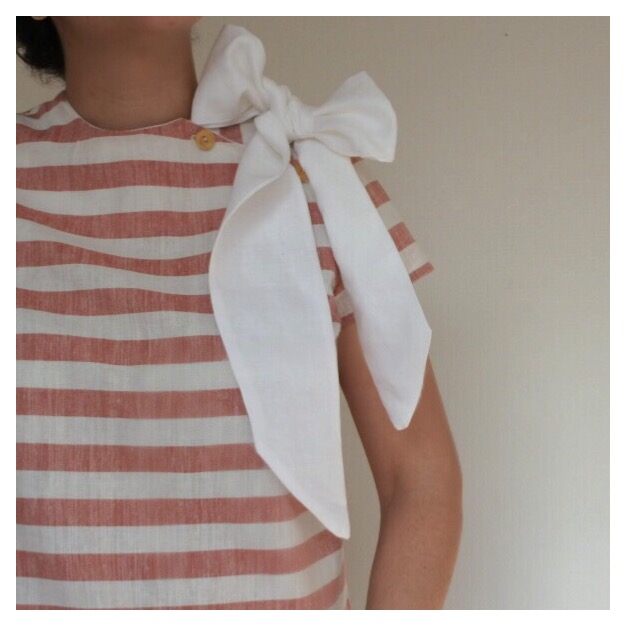 J’ai donc utilisé mon fameux coupon de lin rayé , provenant des Coupons de Saint Pierre. Je n’ai fait aucune modification sur le modèle, mis à part la suppression des volants (ce qui m’a aussi permis de consommer moins de tissu) et l’ajout de ce gros noeud, façon Claudie Pierlot, qui lui, m’a permis d’utiliser une chute de lin Coupons de Saint Pierre, qui me restait de l’année dernière!)
