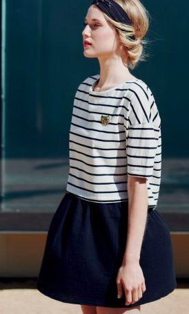 A l’origine de ce tilt : les proportions remarquables de cette blouse tee-shirt : la longueur de manches parfaite, l’effet légèrement blousant, et la rangée de boutons sur le côté qui me rappelaient ce fameux détail des marinières boutonnées Saint James.