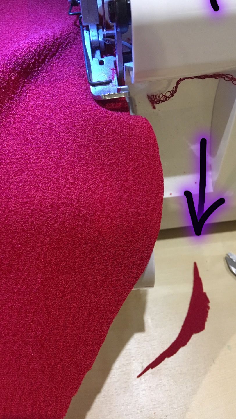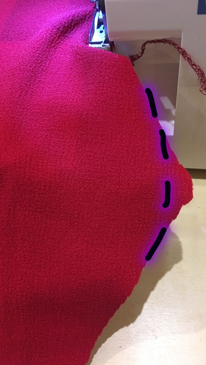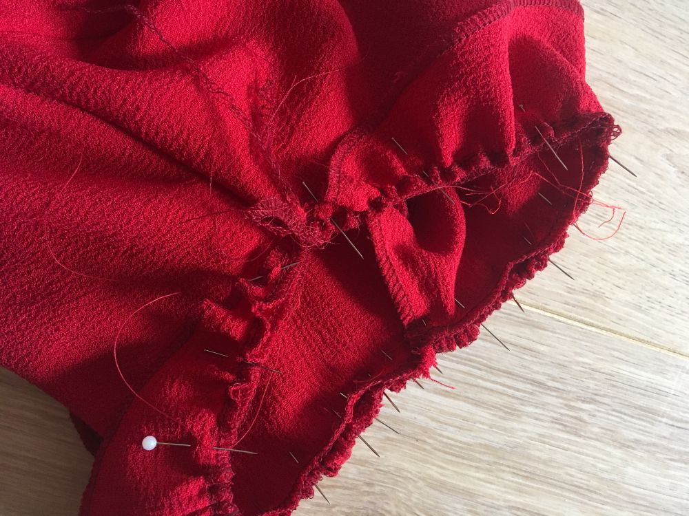 Ensuite j’ai cousu des fils de fronce tout du long, et j’ai surjeté le futur bord de mes volants. Vous pouvez faire un ourlet roulotté à vos volants, mais aussi faire un double rentré. C’est selon vos goûts, mais aussi selon l’épaisseur de votre tissu :)