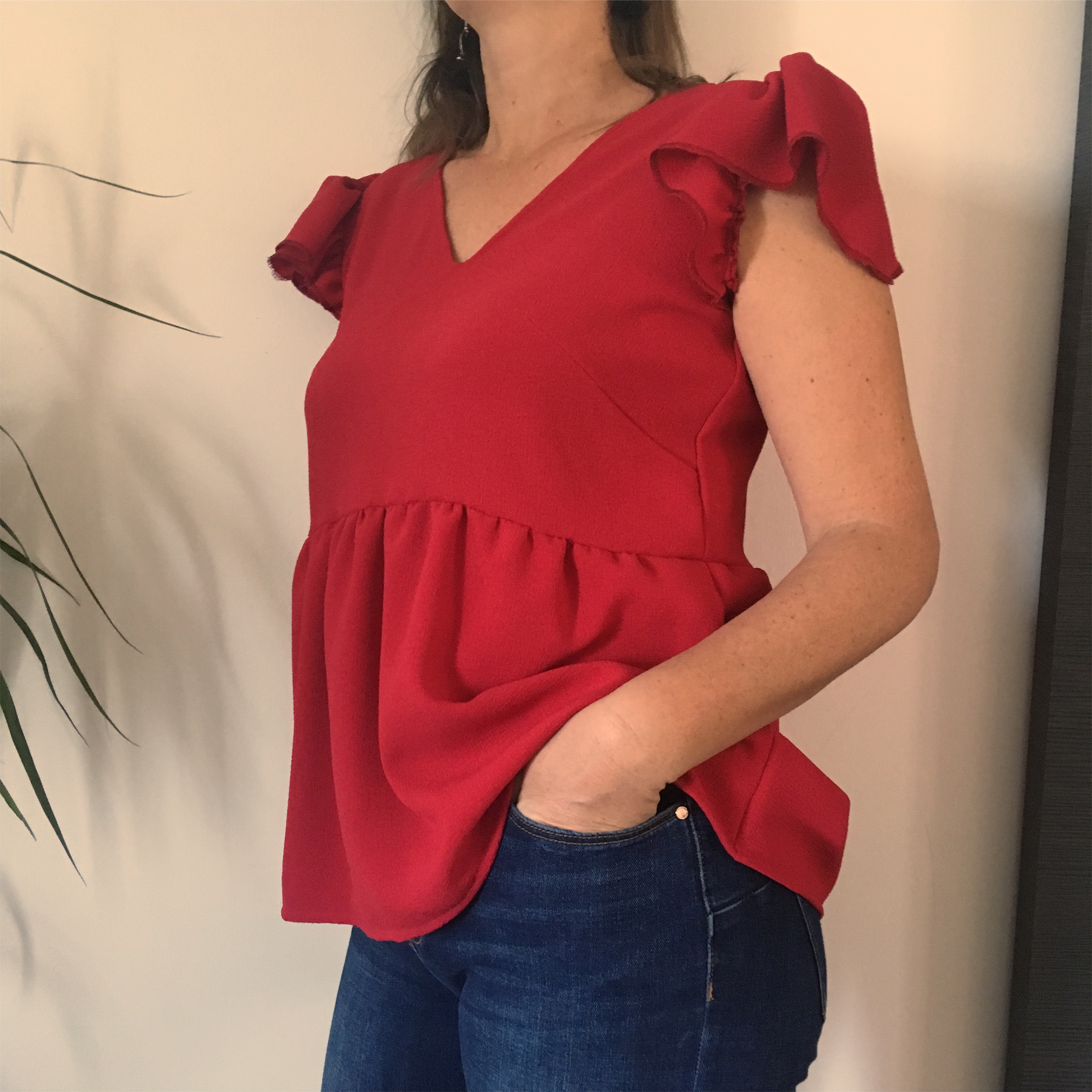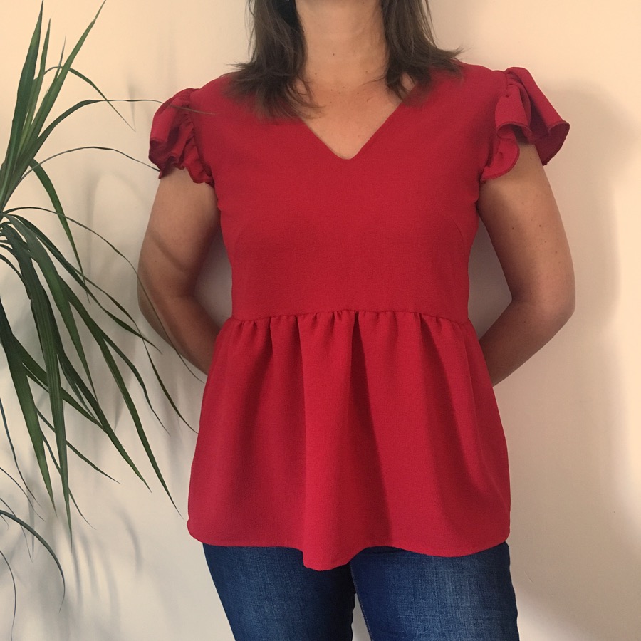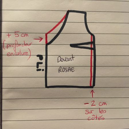 Au début, j’étais donc partie pour faire une robe… Mais n’étant pas adepte des toiles (j’avoue, je n’en réalise presque jamais , honte à moi ….) j’ai décidé de faire d’abord la version blouse pour voir comment le patron tombe sur moi, et les éventuelles modifications à y ajouter. Tout en gardant en tête mon idée de robe Rosae pour une prochaine cousette. J’avais dans mon stock de tissu un superbe crêpe épais acheté chez Diffus laine tissu (leur site Internet s’appelle Mercerine ), mais seulement un tout petit coupon… Du coup, par manque de tissu, mais aussi voyant les beaux jours arriver, j’ai eu l’idée d’enlever les manches au patron et j’ai ajouté des volants aux épaules :) Le patron Rosae est proposé en taille 40. A nous de l’adapter à notre taille. Portant habituellement du 40, je suis partie sur cette taille. J’ai d’abord réalisé la base du patron, c’est à dire le devant et le dos, sans les manches et le bas de la blouse (la basque). Mais, quand est venu le moment de l’essayage, ça ne rendait pas du tout comme sur les photos de … (je dois avoir une morphologie bizaroïde :) (edit de Louise : non je confirme que tu n’as pas de morphologie bizaroide ! :) J’avais réalisé le top peplum en le posant directement sur moi, mais à ce moment je venais d’accoucher et j’allaitais, donc les mensurations bizaroides venaient de chez moi !:) Alors, j’ai apporté ma patte personnelle pour adapter le patron . Si ça vous tente, voici les explications pas à pas : D’abord, j’ai remonté l’encolure, car elle était très profonde sur moi…