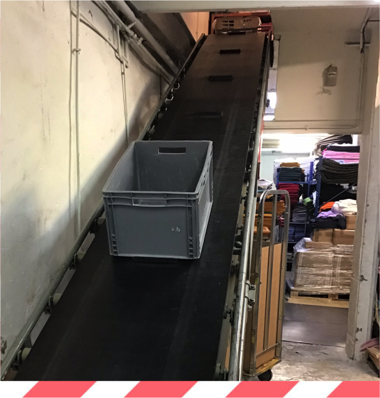 Les rouleaux et coupons valsent entre les différents ateliers en empruntant de nombreux tapis roulants.