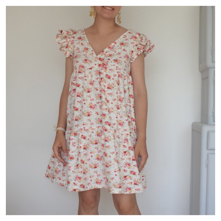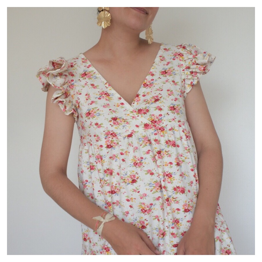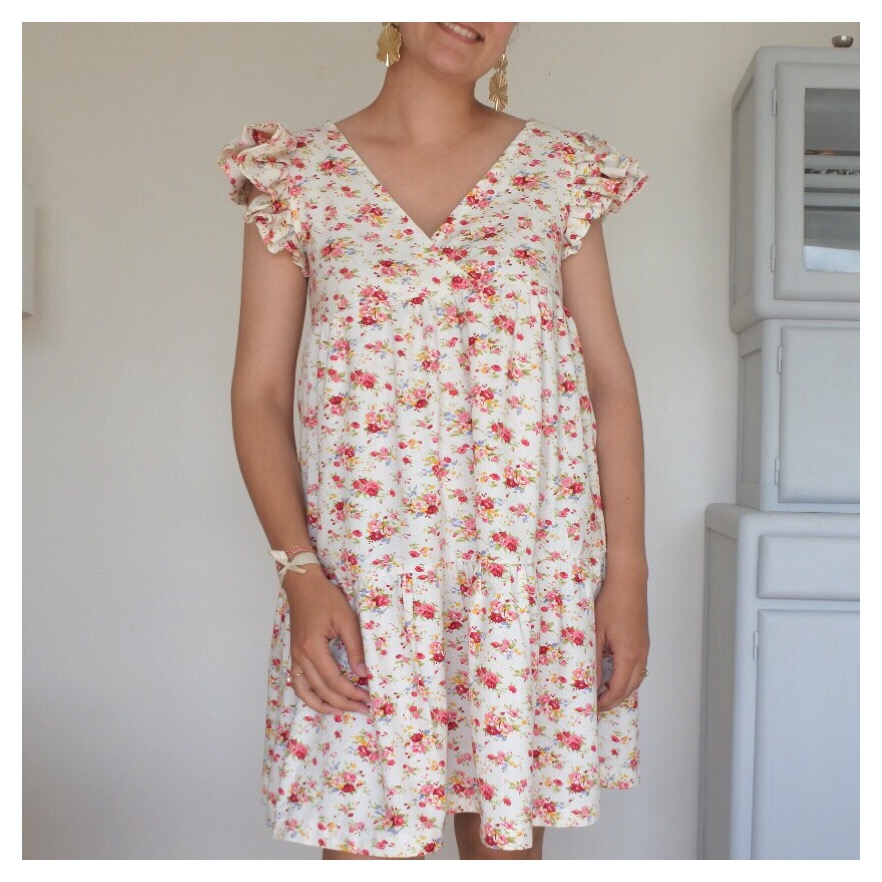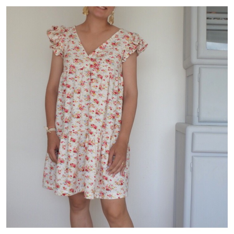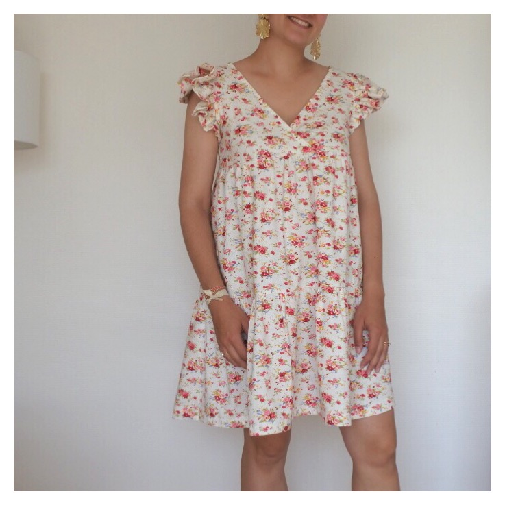 Le tissu Pour cet été, je l’ai voulue en motifs fleuris : rien de mieux que le fameux lin viscose champêtre des Coupons de Saint-Pierre, maintes fois en rupture de stock et réassorti à plusieurs reprises (je ne le vois plus sur le site en version “fond blanc”…mais il y a toujours la version “fond gris” qui est très jolie aussi) ! Je suis très sensible aux questions de transparence: j’avais un petit doute sur la question de doubler ce lin viscose ou pas. Finalement avec les fronces, objectivement, la robe ne nécessite pas de doublure et cela m’a bien arrangée ! En effet, ce coupon est assez épais et lourd, cela m’ennuyait de l’alourdir de nouveau avec une potentielle doublure ! Attention à bien le laver avant usage car il a tendance à légèrement se rétracter et donc rétrécir ! Le patron Je vous avais déjà partagé mon expérience avec ce patron Eugénie (ici et ici). Comme pour la précédente version robe, j’ai repris la largeur de la robe, en la diminuant de quelques cm sur les côtés, de chaque rectangle qui forme le bas ! Les manches J’ai opté pour des manches à volants, dont vous trouverez le super tuto de Made in Estelle ci-dessous. Ce mix fonctionne bien avec la robe, ce détail est original et facile à réaliser !