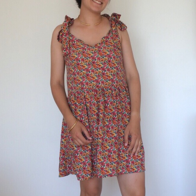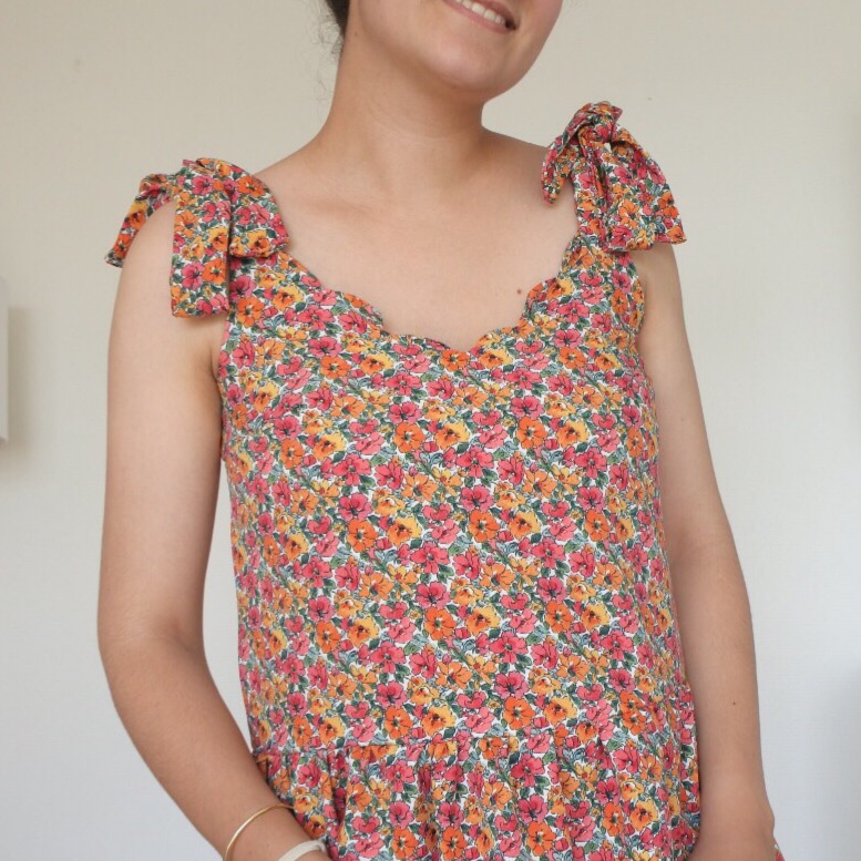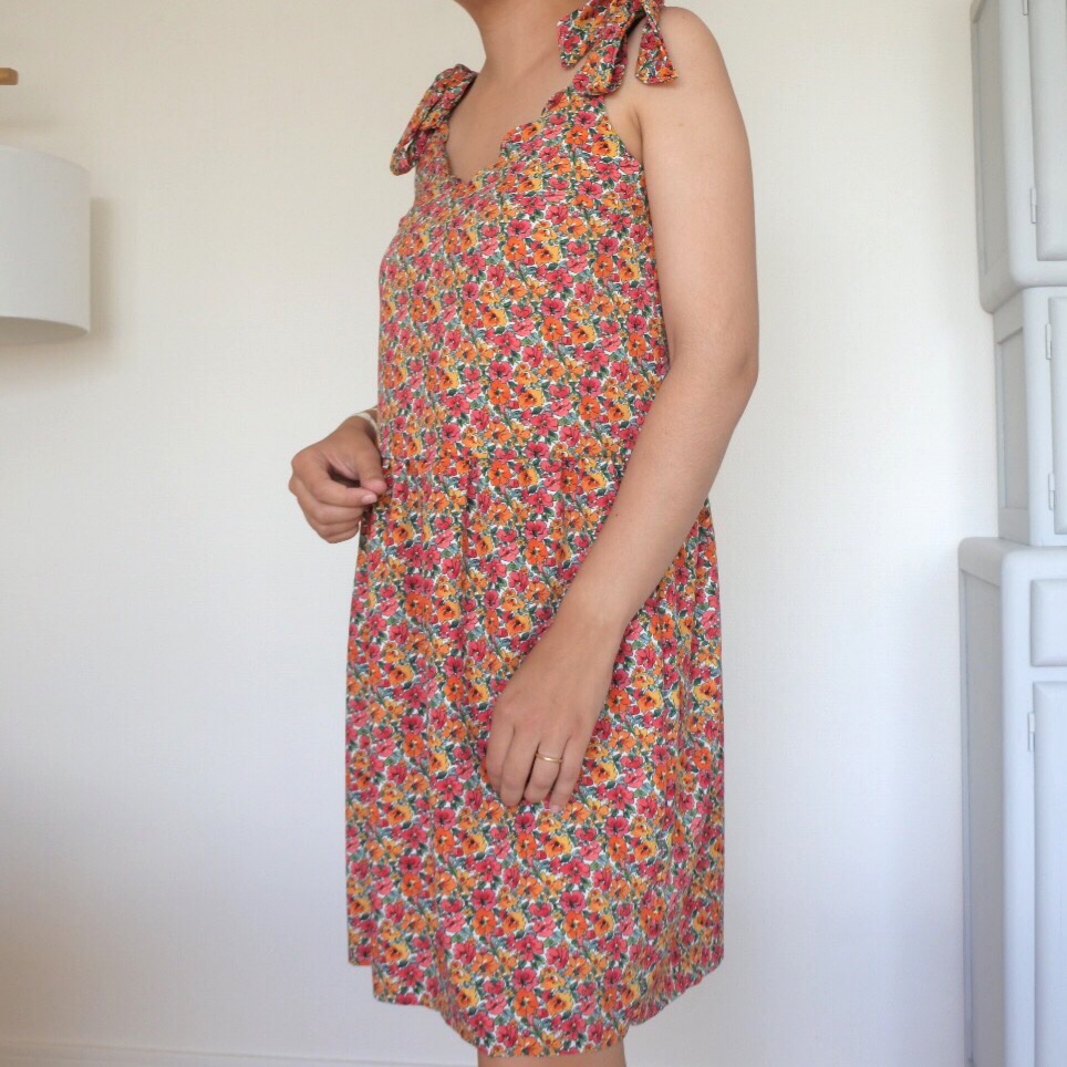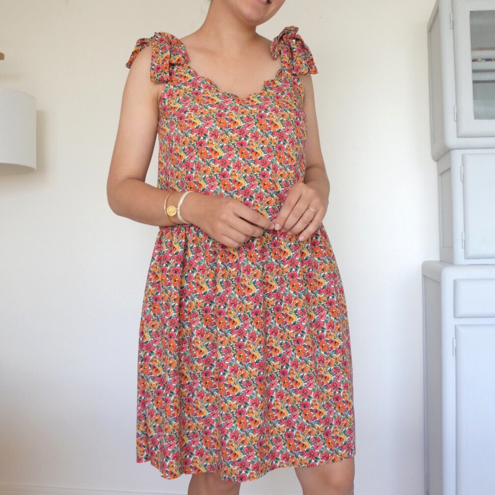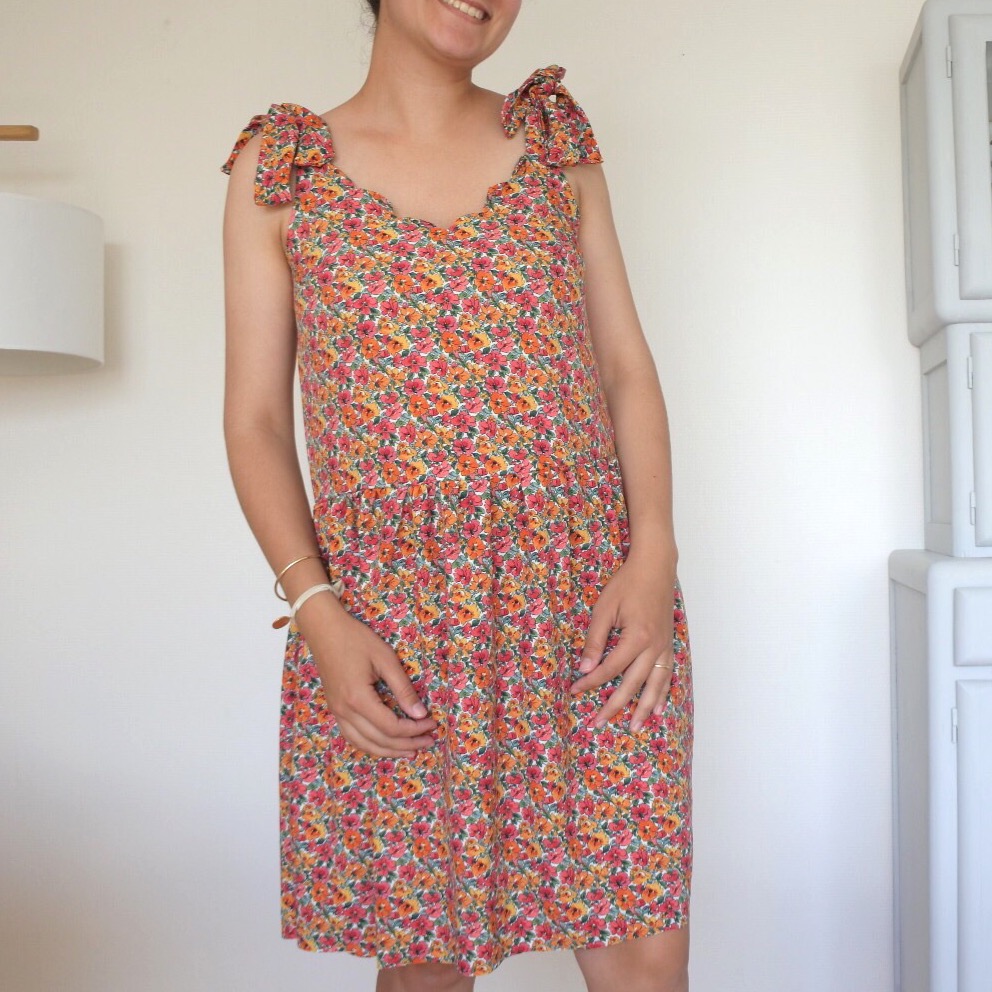 Hacking du patron NANA Il s’agit d’un un patron que je maitrise bien car j’ai réalisé plusieurs tops à l’aide de celui-ci (ici, ici) J’ai donc pris la liberté de le modifier pour lui ajouter une encolure festonnée. Pour cela, j’ai juste dessiné des festons sur l’encolure, en suivant le tuto de Camille (ici). J’ai également opté pour des noeuds plus petits que les originaux (ces derniers ont tendance à glisser et ne sont pas très pratiques à porter avec un gilet par exemple!) Comme pour l’original, le buste est doublé ce qui permet d’avoir de jolies finitions ! Pour transformer la blouse en robe, j’ai seulement découpé 2 rectangles, avec une largeur = 1,3X la largeur du top pour réaliser des fronces. Je les ai assemblés pour former la jupe, à son tour fixée au buste ! Le choix du tissu Il s’agit d’un tissu très agréable : léger, lumineux et non transparent, pas besoin de le doubler ! Il ne bouge pas aux lavages. En revanche, pour réaliser des festons, je n’ai peut-être pas réalisé de choix judicieux! En effet, ce tissu n’a pas besoin de repassage car il fait très peu de plis. Le revers de la médaille est qu’il est compliqué de marquer des coutures au fer, comme pour les festons ! J’ai rencontré beaucoup de difficultés pour les former, une fois retournés à l’endroit car ils glissaient et ne se maintenaient pas très bien! Ma persévérance a finalement payé puisque ces festons se maintiennent plutôt bien et qu’il ne se passe pas une semaine sans que je porte cette petite robe ! Récapitulatif des fournitures :