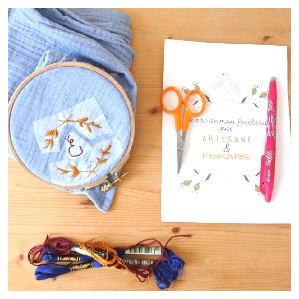 Lors d’une soirée Artesane X Fiksar, nous avions appris à broder un superbe foulard en double gaze : je trouvais l’idée excellente ! Cet accessoire est facile à réaliser et à porter : pour soi-même ou nos enfants ! J’ai donc réutilisé ce principe avec l’objectif de réaliser plusieurs foulards / langes, en employant ce matériel : - Les motifs de broderie : vous pouvez en trouver fournis avec les cours Artesane, dédiés à la broderie. Pour ma part, j’ai choisi les motifs issus du cours “ J’apprends à broder 13 projets estivaux” et le “Mon coeur fait Boum” que vous pouvez trouver gratuitement ici.