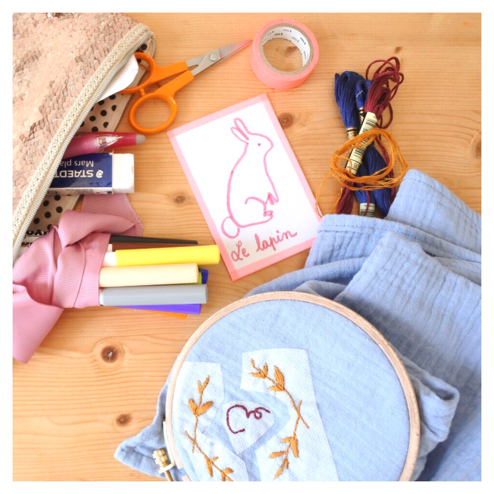Comme à chaque vacances, je prends plaisir à me constituer des petits kits DIY maison pour réaliser des petits bricolages lors de ces périodes propices à davantage de loisirs , et à emporter pour occuper les long voyages ! Cet été, comme je ne peux pas emmener ma machine à coudre, j’ai opté pour 2 activités un peu différentes : la broderie et le dessin, et me suis donc créée un petit panier garni de matériel, me permettant d’approfondir ces matières ! La seule contrainte que je me suis fixée : toutes les fournitures doivent tenir dans cette pochette, que je peux glisser facilement dans mon sac à main !