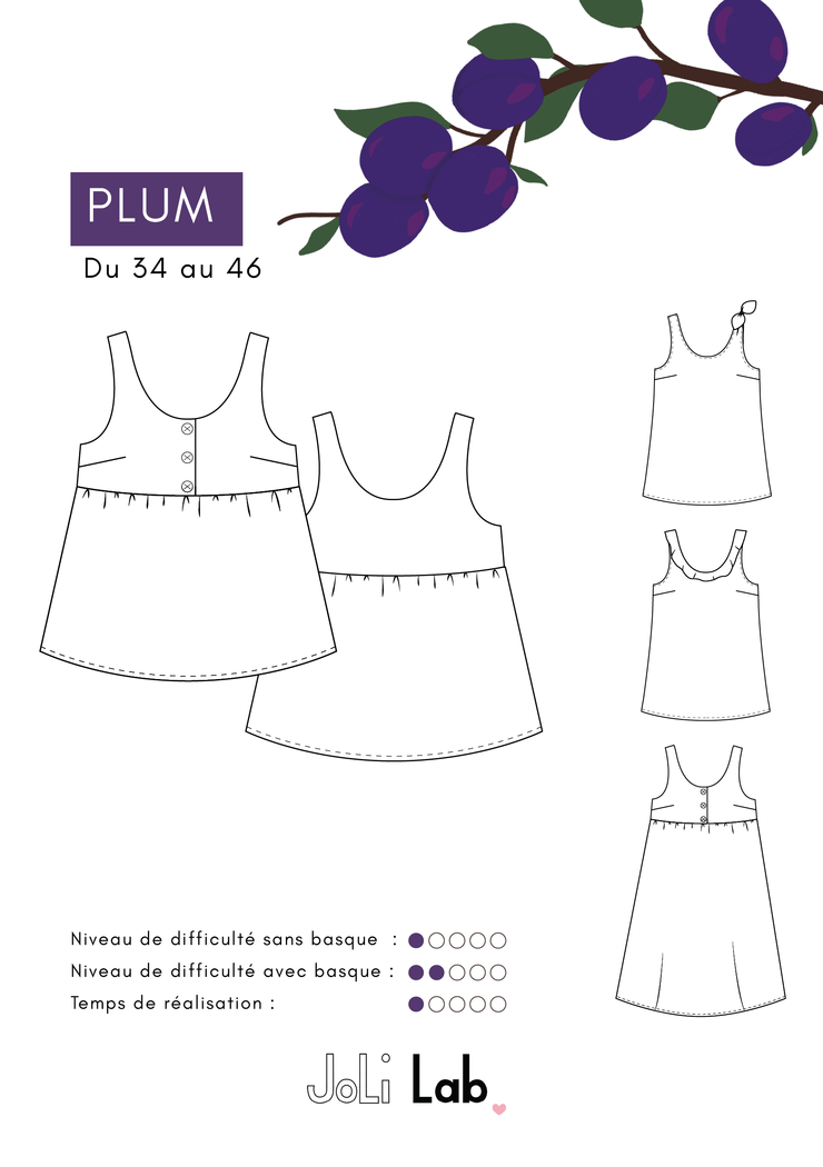 Le patron Le patron Plum permet de confectionner un petit haut d’été, en choisissant votre détail préféré :