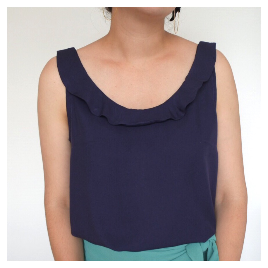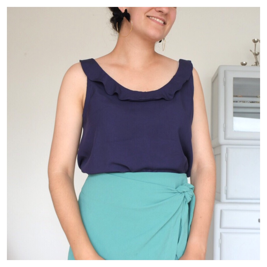 La planche de patron est classique, les pièces ne se chevauchent pas. Les tailles sont gradées du 34 au 46. Les explications sont claires, agrémentées de photos. Je n’ai pas rencontré d’impasse particulière : le montage du volant est juste un peu plus compliqué (cette difficulté est d’ailleurs indiquée pour cette version du top). Le résultat correspond tout à fait au modèle indiqué : avec un effet blousant, très agréable pour cet été.