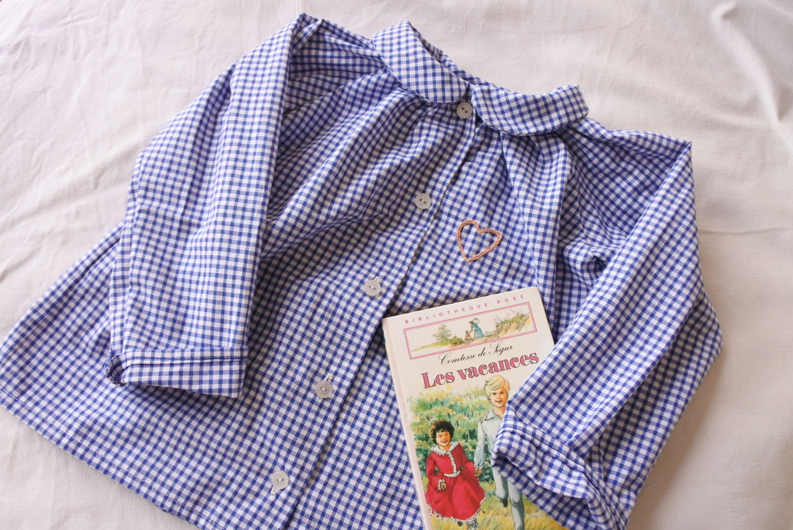 Le patron Odette de Citronille J’ai déjà eu l’occasion de décrire ce patron (ici), et je confirme que cette pièce est un modèle très agréable et accessible! Les difficultés résident seulement dans les fronces au col, à bien répartir entre les différents repères. J’ai également investi dans un pied à boutonnière Singer, très basique mais qui m’aide grandement pour obtenir de jolis finitions! Par rapport aux précédents modèles, j’ai également réalisé plus de couture à la main : la couture du pied de col et les points invisibles pour maintenir les rabats du devant. Finalement, ces points sont aussi solides que ceux d’une machine, et les finitions bien plus jolies. Joli coeur Je n’ai pas pu m’empêcher d’ajouter une petite touche de broderie pour orner Odette : j’ai simplement dessiné un coeur et réalisé un double rang de points de tige, un point très simple, qui change du point arrière avec un rendu plus doux!
