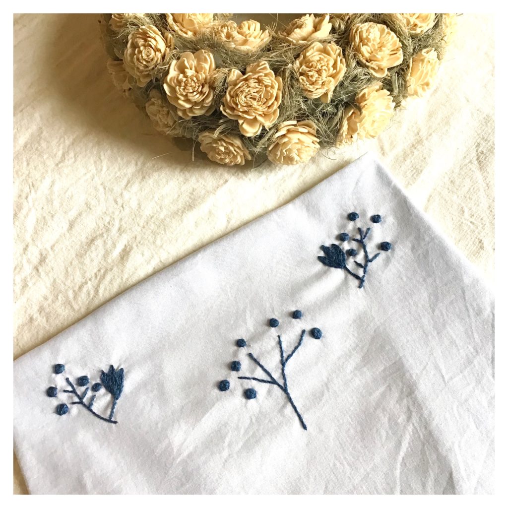 Pour la broderie, j’ai appliqué de nouveaux points, tels que le point de roue, pour réaliser les petits ronds à l’extrémité de chaque tige! Un point très ludique, appris grâce aux cours de Martine, sur Artesane! Le motif est également issu du cours de Martine! Je n’ai utilisé qu’un fil bleu marine, car j’ai un faible pour les broderies monochromes, qui donnent de l’intensité aux points, puisque l’oeil n’est pas distrait par les changements de couleurs!