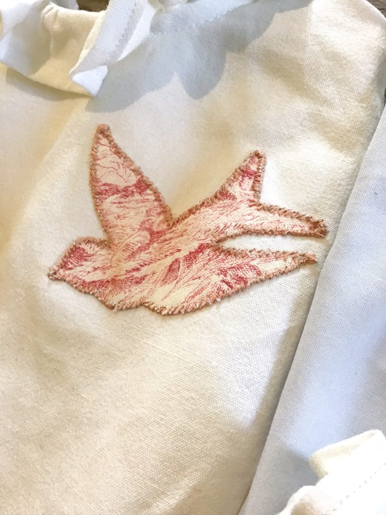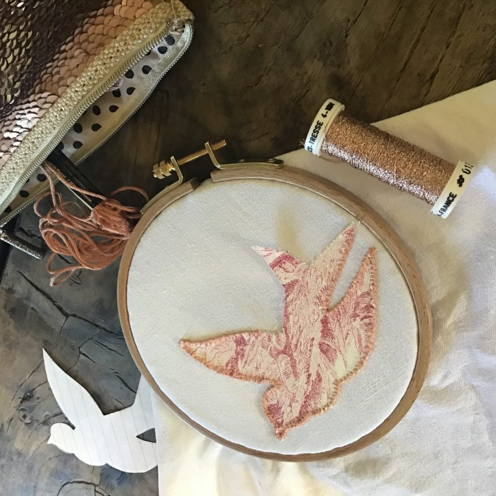 La troisième Electre a été l’occasion de tester une technique de broderie qui me fait envie depuis très longtemps : les appliqués! Pour cela, j’ai suivi le cours de Martine “ Devenez expert en broderie : brodez des appliqués et de la soie” . Au lieu des motifs floraux qui me paraissaient très complexes, j’ai dessiné un motif très printanier : l’hirondelle! Je l’ai répliqué sur des chutes de tissus d’ameublement, en toile de Jouy et je me suis lancée dans le point qui permet de plaquer le tissu tout en évitant qu’il ne s’effiloche! Le coupon de toile de Jouy n’était peut être pas le meilleur choix : il est très épais et s’effiloche énormément, ce qui a nécessité des points de couture plus épais! Sur l’une des hirondelles, j’ai tenté un surjet avec le fil métallisé d’Au Ver à Soie, ce qui donne un aspect plus précieux au motif, très agréable!