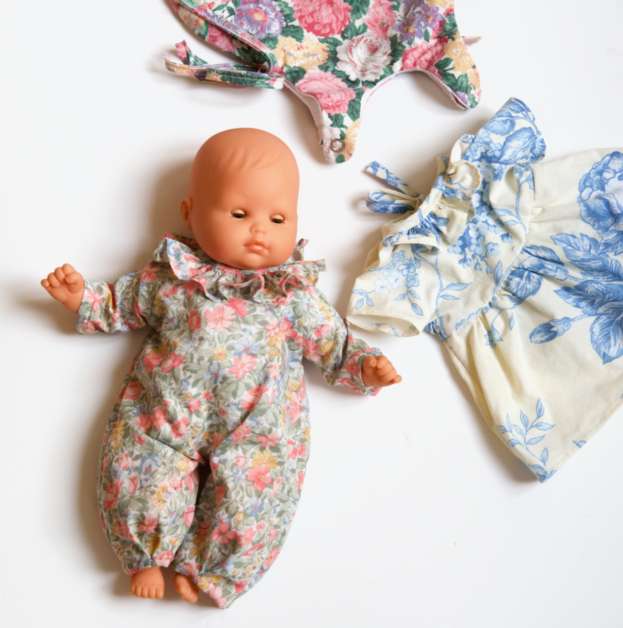 Après les jolis vêtements pour poupées cousus dans de précieuses chutes et dans les très jolis tissus Sous le figuier, voici Marguerite, Martine et Fantômette déclinées à la mode vintage !