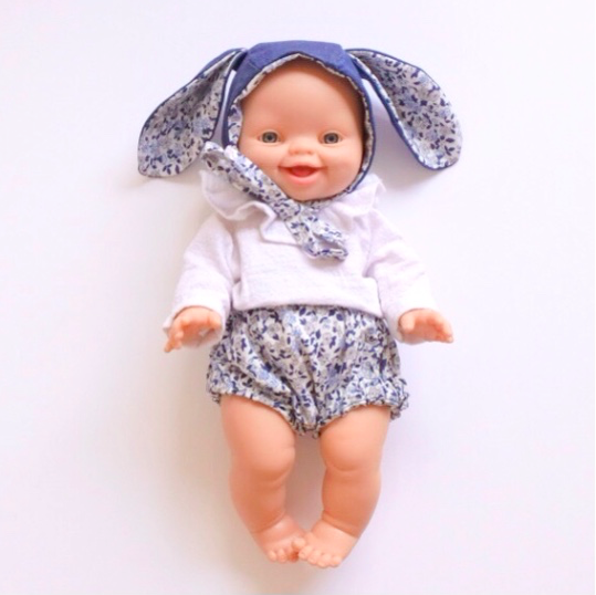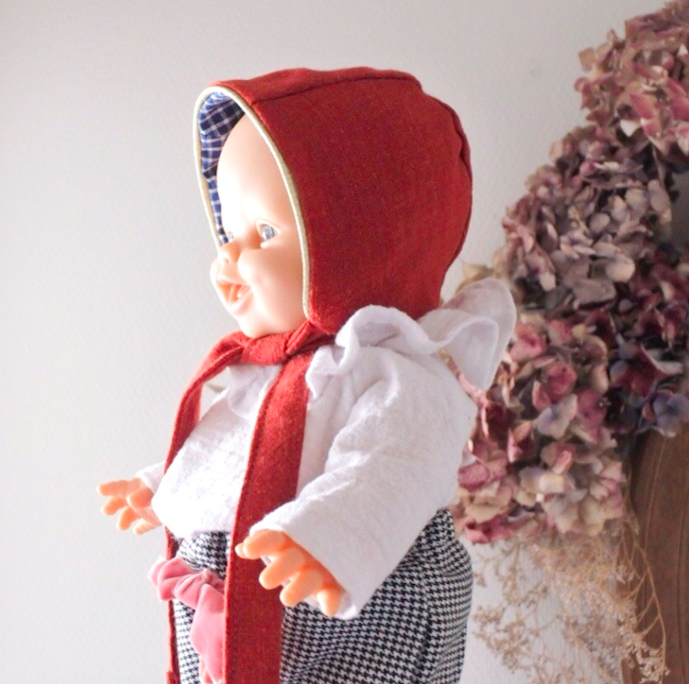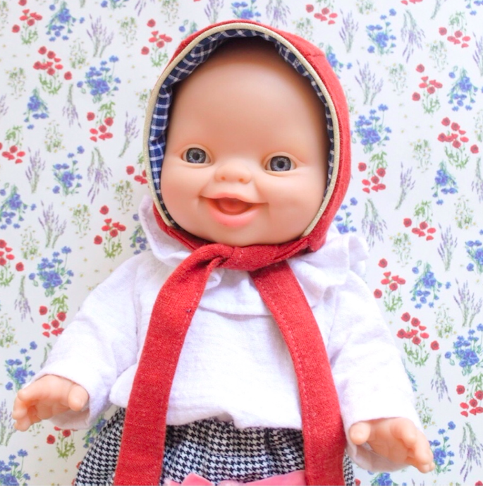 Ce béguin a été modélisé sur une Paola Reina (34 cm) et convient également aux poupées Corolle de 30 à 34 cm ! Ici, il complète joliment la combinaison Fantomette réalisée en double-gaze.