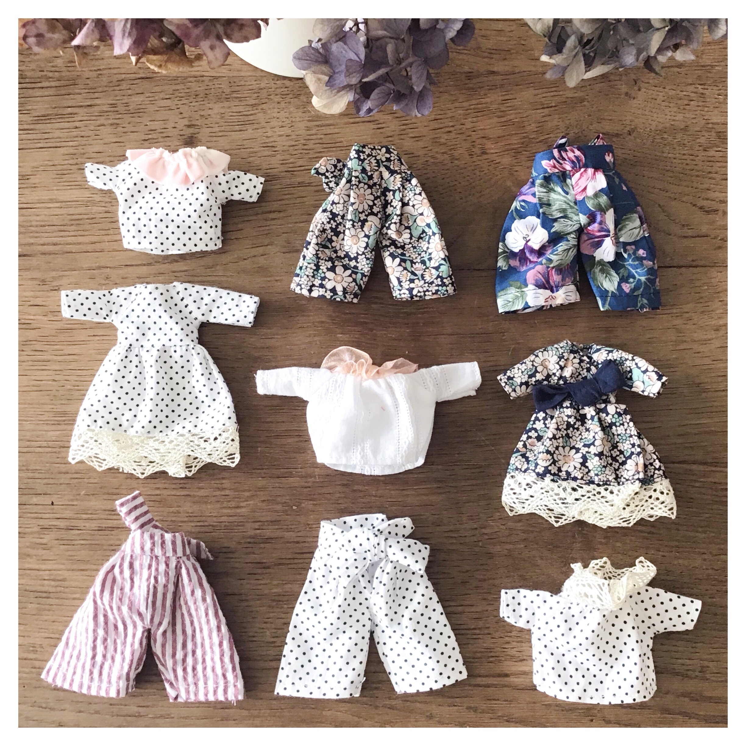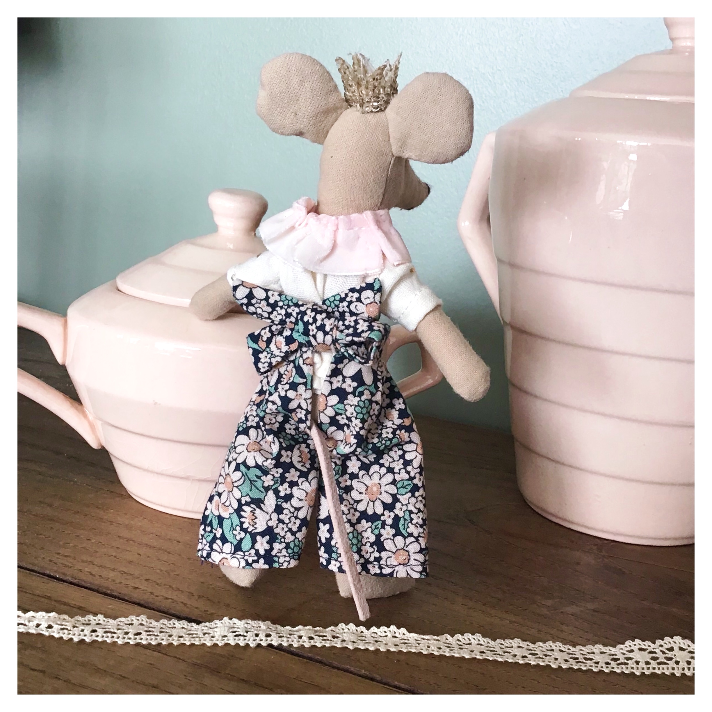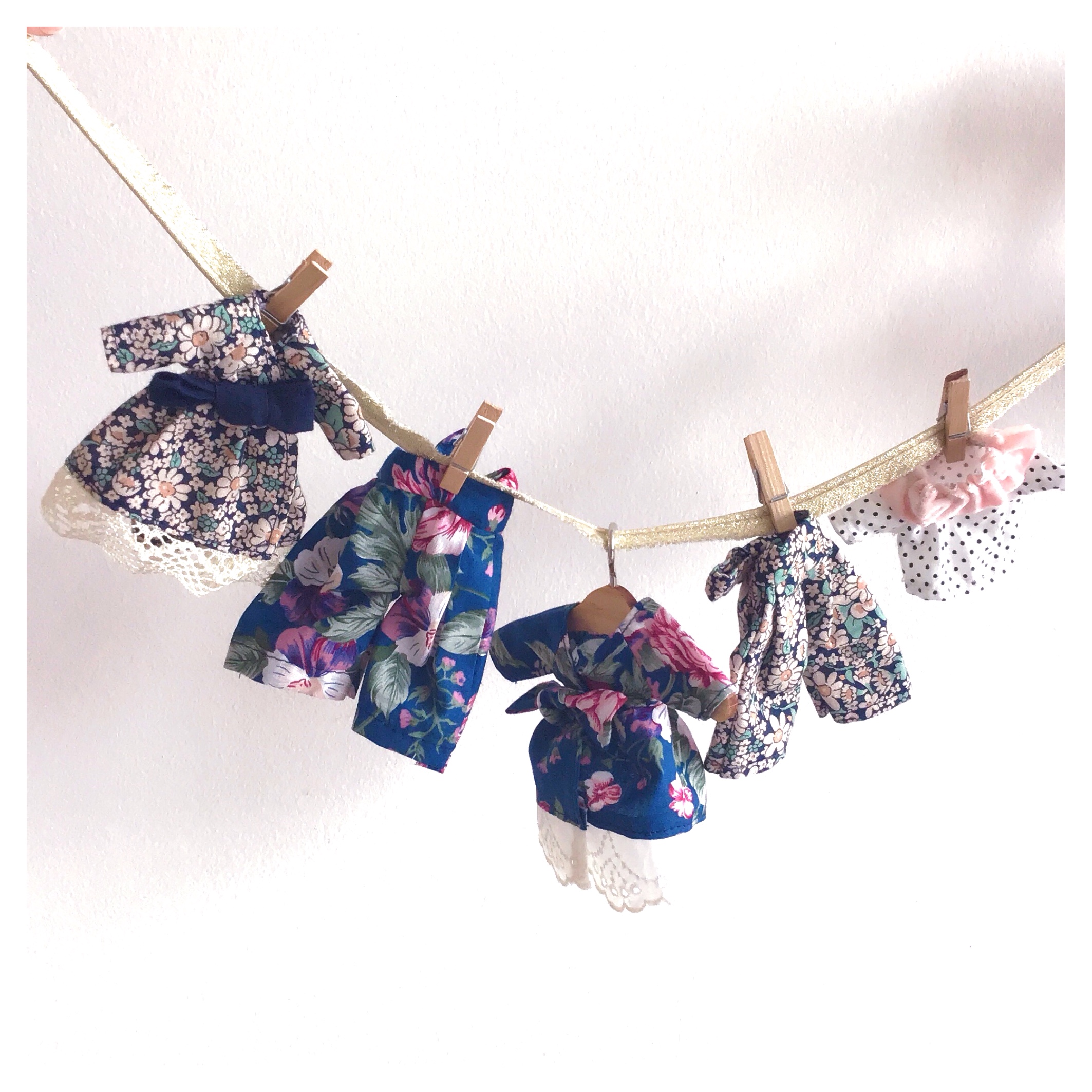 La confection de ces tenues rassemble plusieurs aspects très agréables et complètement régressifs ! Les pièces sont à couper dans de très petits coupons de tissus et vous pouvez les orner de broderies anglaises, boutons, dentelle etc… Dans ce mini vestiaire, il y a donc de la magie (qui nous a beaucoup fait penser à celle qui animait les petites souris couturières de Cendrillon) à rassembler puis assembler des bouts de tissus, de rubans, de la petite mercerie pour confectionner une jolie garde-robe ! Par ailleurs, pour celles qui aiment la couture à la main et ses vertus relaxantes, les 3 pièces sont faciles à coudre armées d’une bobine de fil et d’une aiguille ! De notre côté, nous avons confectionné ce vestiaire lors d’un périple à la campagne : le plaisir de pouvoir coudre ces mignons objets, tout en profitant d’un jardin !