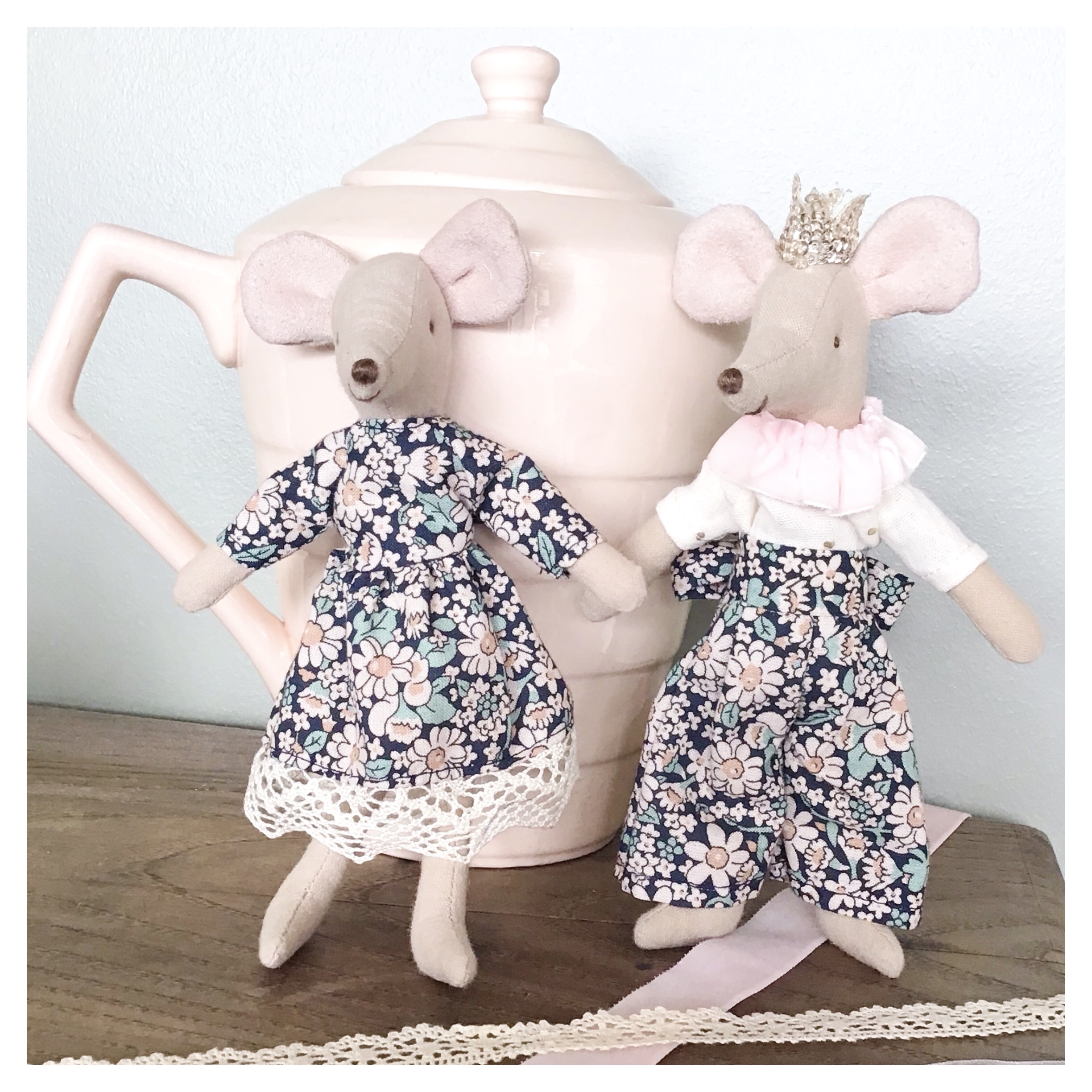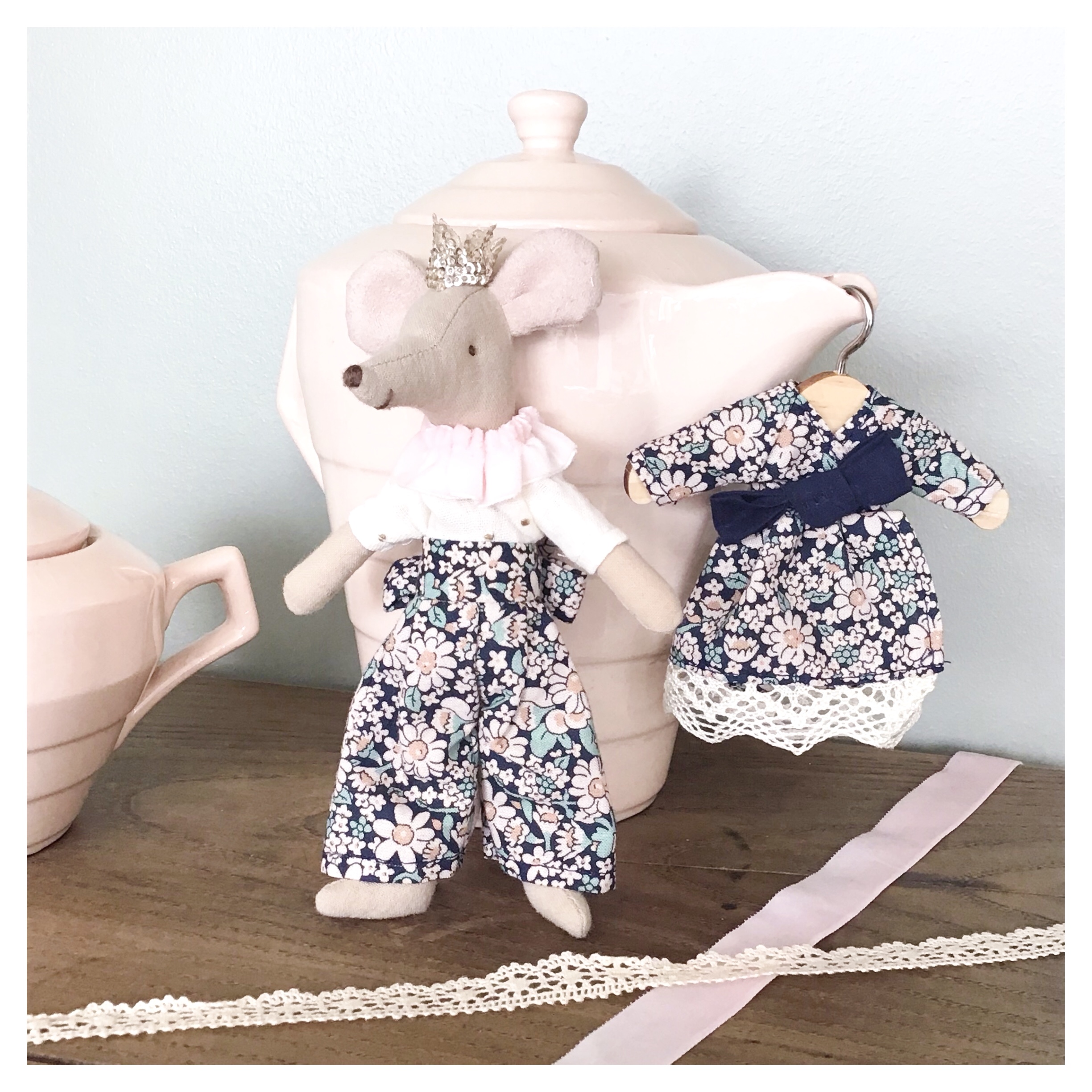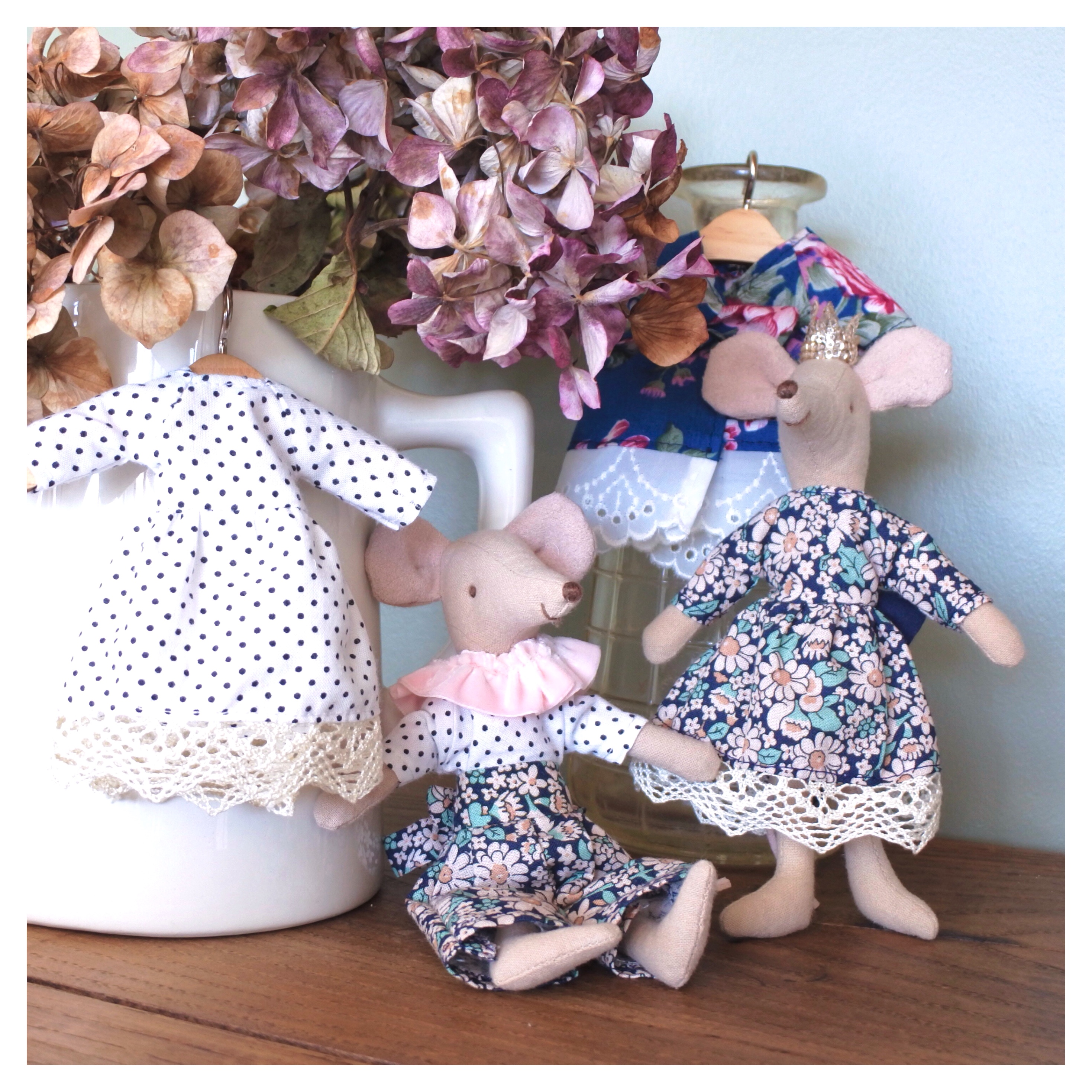 Nous aussi, nous avons cédé à la mode des petites figurines Maileg, qui ont rejoint les jeux des enfants ! Évidemment, il fallait qu’elles soient aussi bien habillées que les poupées ! Nous nous sommes donc lancées dans le patronage d’un mini vestiaire de printemps, pour pouvoir les vêtir de tenues complètes ! Nous avons choisi des détails aux accents légèrement rétro, assortis à l’univers des Maileg, et qui nécessitent très peu de fournitures !