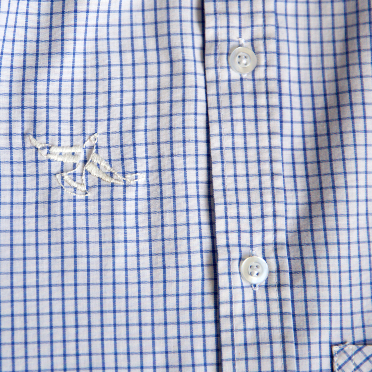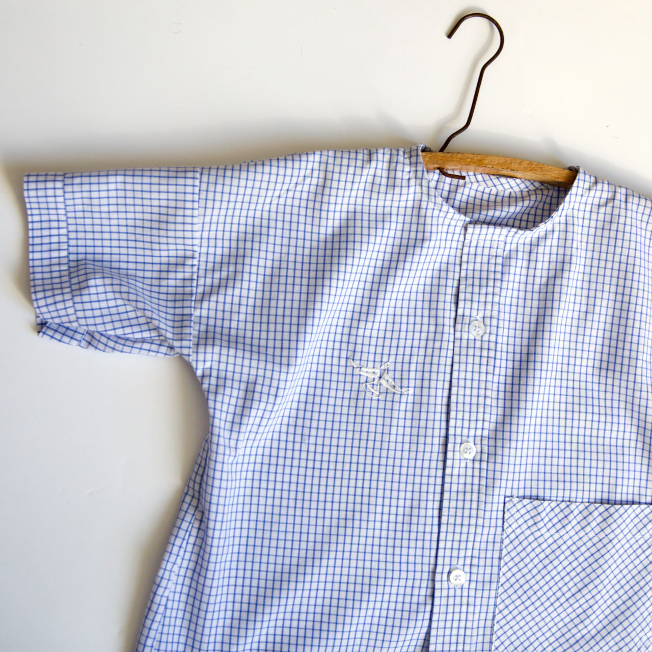 Chaque modèle possède ses petits détail : la forme des poches qui changent, la longueur des manches… Mais surtout une petite broderie sur deux des blouses ! Sur la version en vichy rouge, j’ai brodé une initiale avec notre alphabet au point de croix, et sur celle à carreaux bleu, un petit oiseau blanc de notre planche vintage “Les oiseaux”.