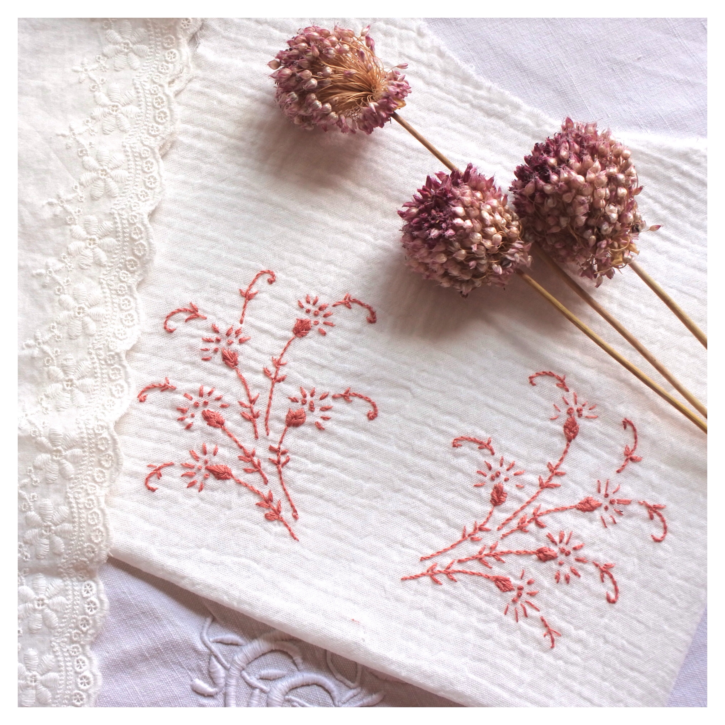 Avec Rosa canina, nous nous étions plongées dans le travail de Pierre-Joseph Redouté, un artiste belge célèbre pour ses planches botaniques. Hortus et Flores rendent hommage aux brodeuses d’antan, qui embellissaient vêtements et linge de maison.