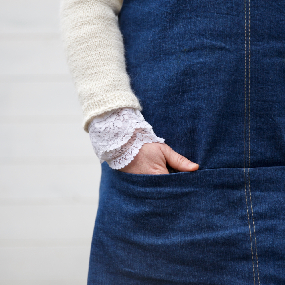 Sous la robe Tilia, je porte un pull tricoté main : le modèle Romy de Along avec Anna, en laine Puna de chez Drops. Et en dessous, c’est aussi un vêtement fait-main : la chemise Hazel de Joli lab, pour laquelle j’ai utilisé d’anciennes dentelles achetées chez Emmaüs sur le col et les poignets de manche.