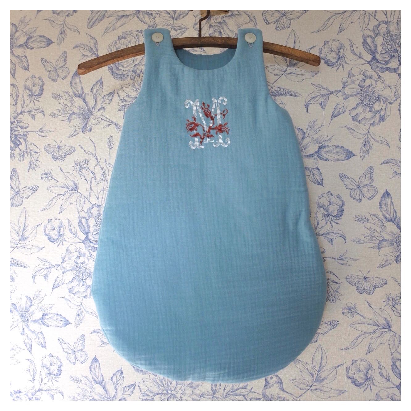 La seconde turbulette a été cousue dans une double-gaze à la teinte amande très douce. Le grain épais de coupon Batikou shop m’a donné envie de relief et de point de croix ! Il s’agit également d’un monogramme glané sur Pinterest, et brodé dans des couleurs assorties au reste du vestiaire bébé. Pour broder ce motif, je me suis aidée d’une toile Aida. Au lieu de faire plusieurs allers-retours entre le modèle et la toile pour compter les rangs de points, j’ai redessiné tout le motif sur cette toile à l’aide d’un stylo Frixion. Puis, j’ai cousu la toile Aida sur le devant de la turbulette et brodé directement le motif dessus. J’ai ensuite retiré les fils de la toile Aida à la pince à épiler.
