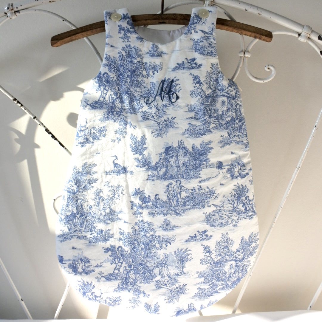 J’ai décliné la turbulette en 2 versions aux accents vintages. La première pièce est parée de motifs Toile de Jouy : une étoffe que j’affectionne particulièrement (vous pouvez d’ailleurs retrouver notre podcast avec la Directrice du Musée de la Toile de Jouy ici). J’ai associé ces motifs désuets à un monograme ancien trouvé sur Pinterest, dans des couleurs ton sur ton.