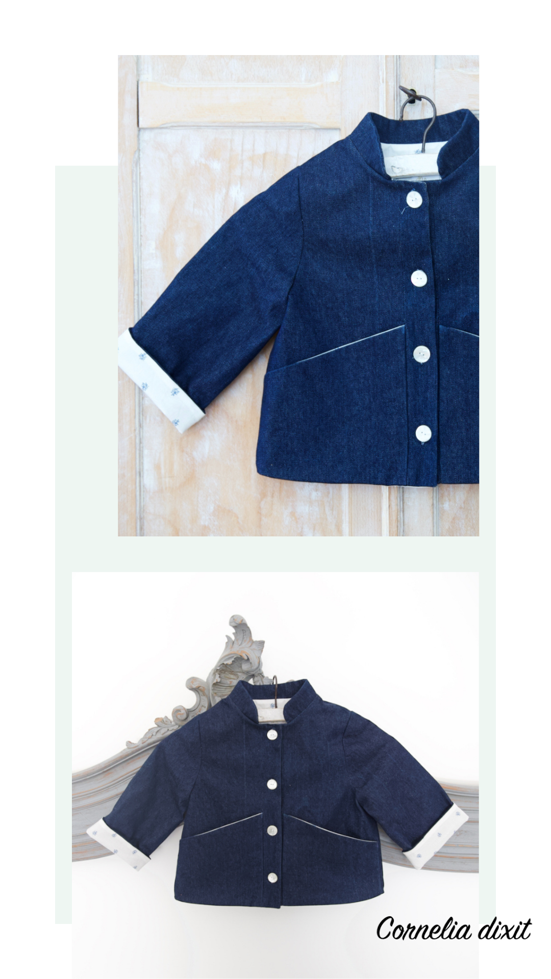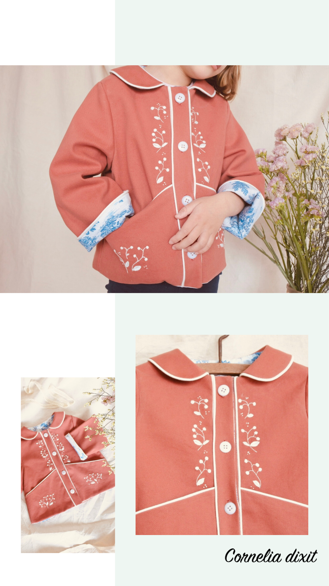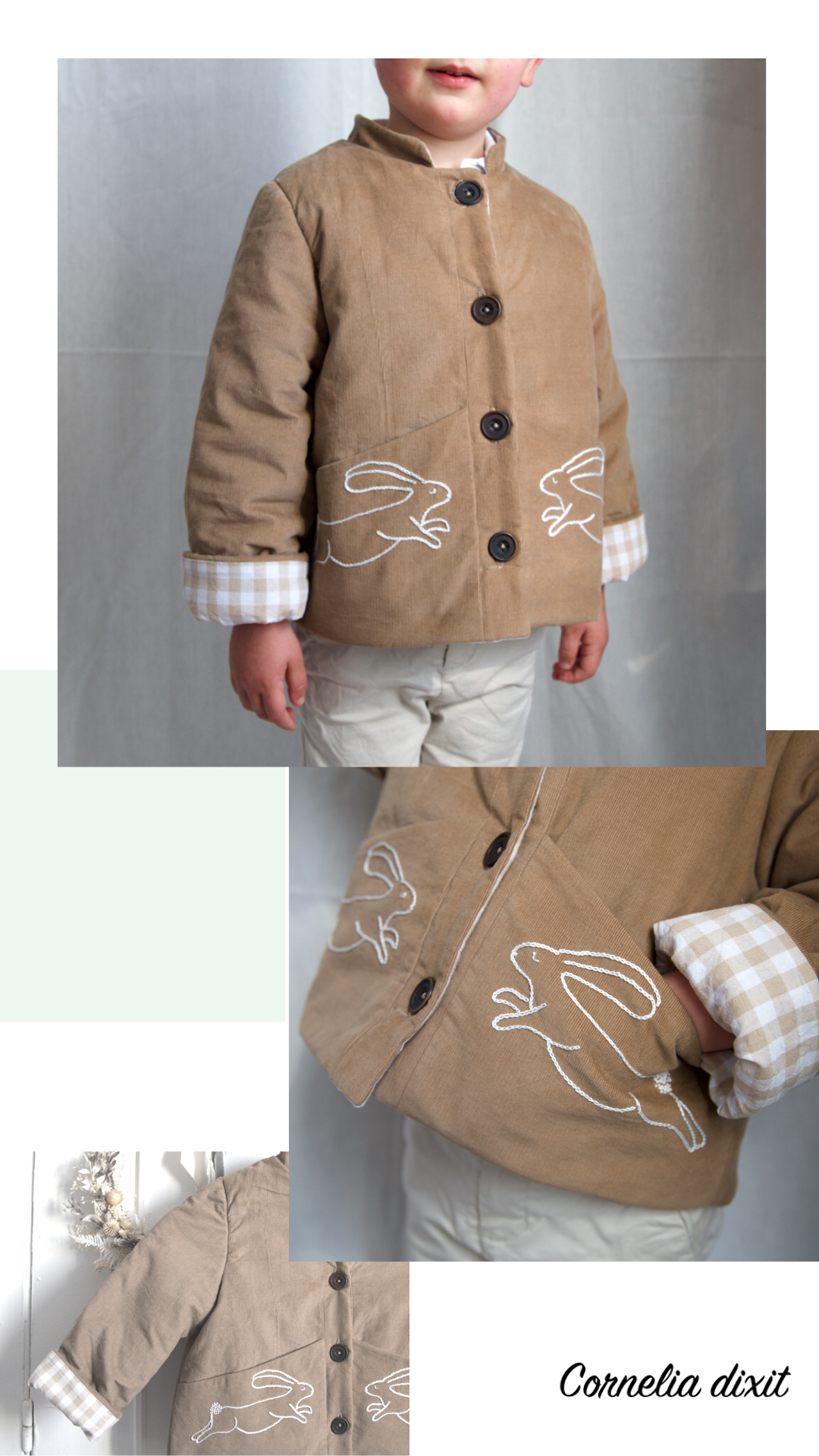 Avec ce premier patron, nous avons souhaité offrir la possibilité de coudre une pièce digne des maisons de luxe pour enfant : une veste confectionnée avec soin, aux lignes fortes et qui se prêtent à l’ornement. Couturières et brodeuses, nous avons la chance de pouvoir créer des vêtements uniques grâce à nos savoir-faire ! Nous avons la possibilité d’ajouter un supplément d’âme au vestiaire de nos enfants, en prenant le temps de les orner de merveilleuses finitions et à la hauteur de l’affection que nous portons à nos petits ! « Ciseler » un vestiaire constitué de pièces iconiques à l’aide de lignes fortes et de broderies à la main… une pièce que l’on a envie de conserver comme un trésor et de transmettre aux générations suivantes: telles ont été les ambitions qui nous ont guidées dans la création de ce premier patron !