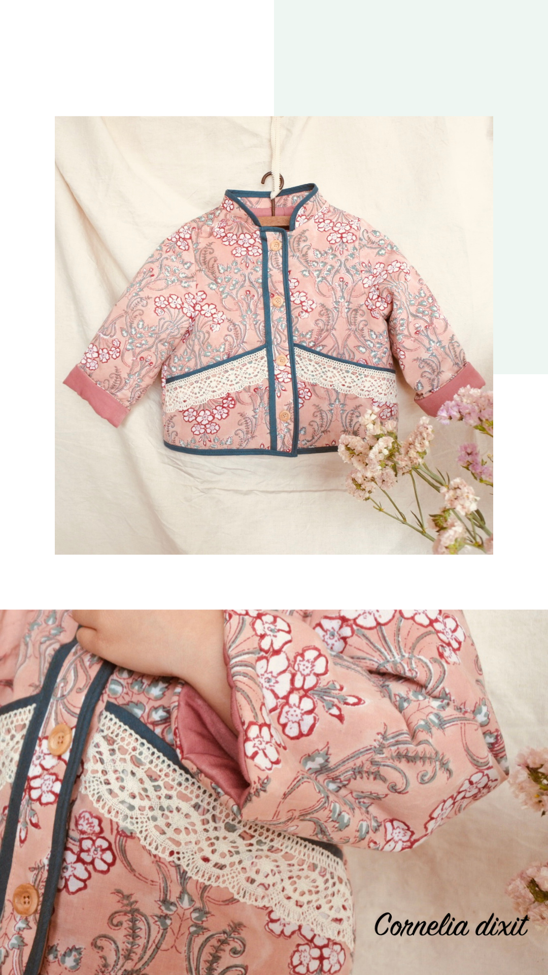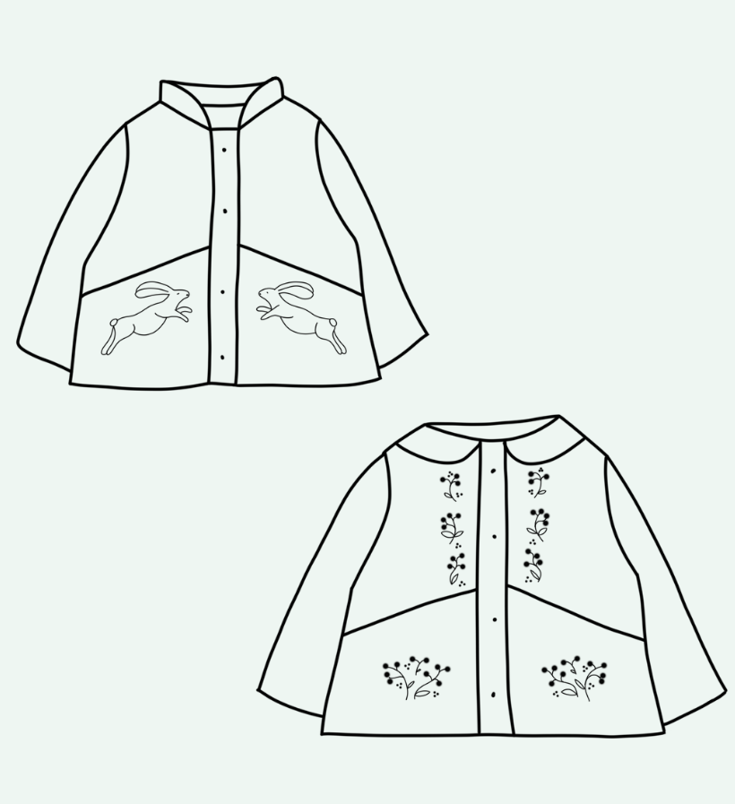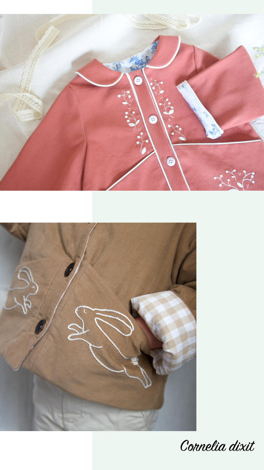 Avec ce premier patron, nous avons souhaité offrir la possibilité de coudre une pièce digne des maisons de luxe pour enfant : une veste confectionnée avec soin, aux lignes fortes et qui se prêtent à l’ornement. Couturières et brodeuses, nous avons la chance de pouvoir créer des vêtements uniques grâce à nos savoir-faire ! Nous avons la possibilité d’ajouter un supplément d’âme au vestiaire de nos enfants, en prenant le temps de les orner de merveilleuses finitions et à la hauteur de l’affection que nous portons à nos petits ! « Ciseler » un vestiaire constitué de pièces iconiques à l’aide de lignes fortes et de broderies à la main… une pièce que l’on a envie de conserver comme un trésor et de transmettre aux générations suivantes: telles ont été les ambitions qui nous ont guidées dans la création de ce premier patron !