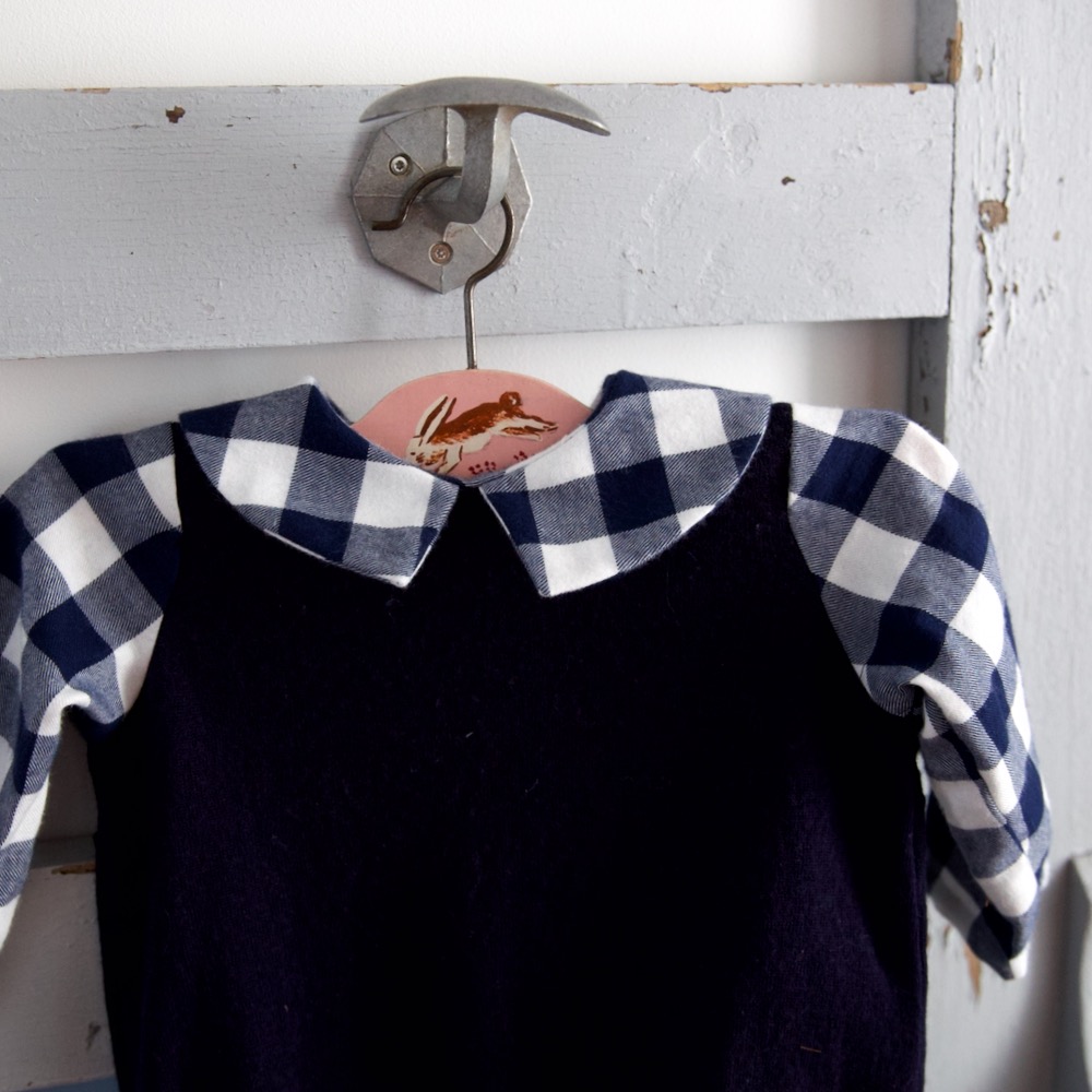 Côté style, j’ai opté pour le petit col pointu, qui est mon préféré pour les garçons. Le patron propose également un col Claudine et un col volanté. Pour les matières, j’ai choisi pour un coton gratté qui est en fait une housse de couette achetée en ressourcerie, qui a déjà servi pour une robe femme et un pyjama en taille 3 ans. Le col a été cousu dans une chute de piqué de coton que j’ai entoilée.
