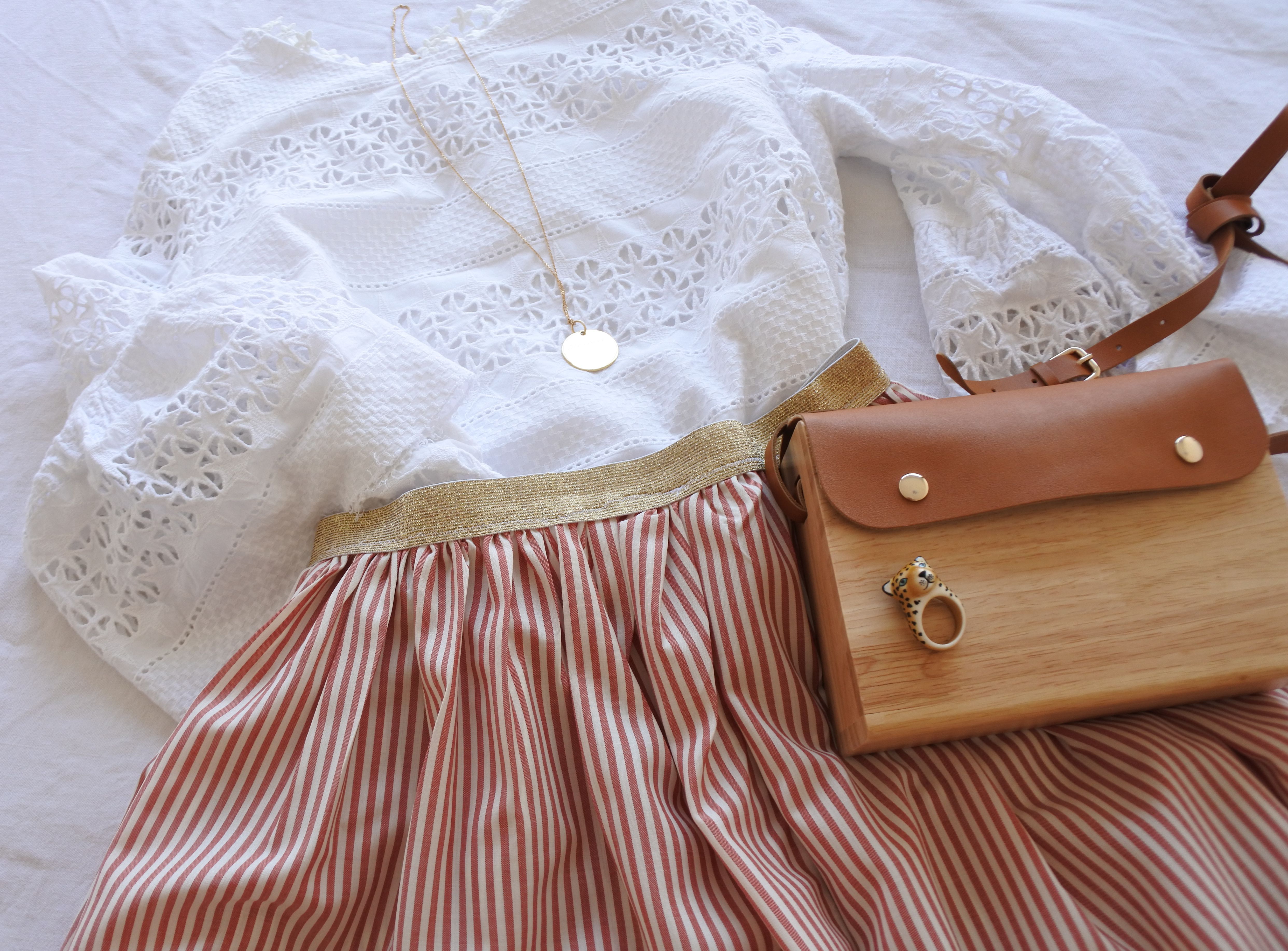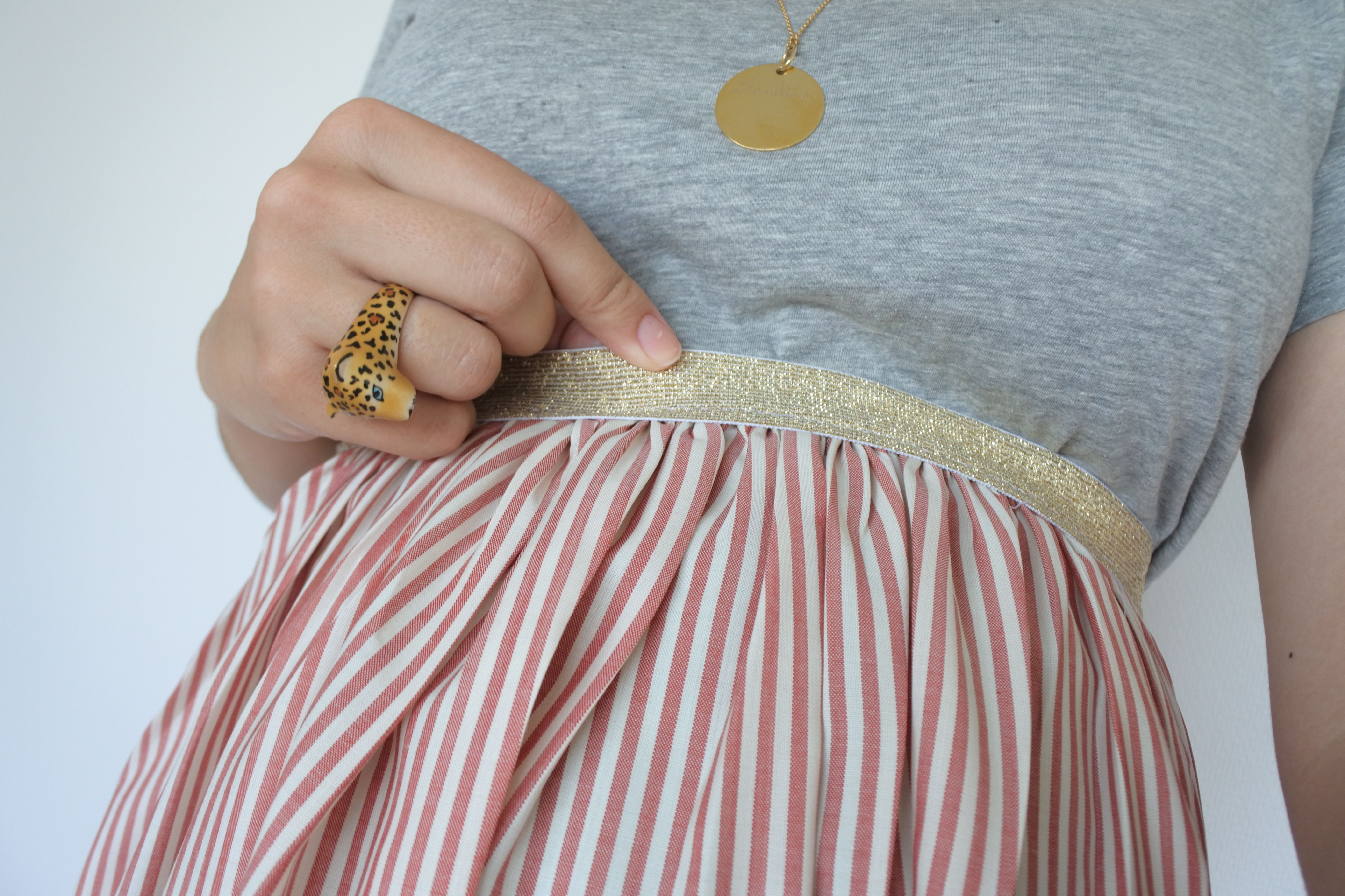 Ensuite, au niveau de la méthode, je me suis appuyée sur ce tuto, proposé par l’Atelier de la Création. Lors d’un premier test, comme indiqué sur le tuto, j’ai utilisé toute la largeur de la laize pour avoir la largeur de la jupe. Mais, au final, je trouvais les fronces trop épaisses. J’ai donc diminué la largeur de la jupe (je n’ai plus les dimensions exactes, mais cela doit correspondre à environ 1m de large pour le devant et 1 m de large pour l’arrière). Par ailleurs, j’ai réalisé des coutures anglaises pour les côtés de la jupe et ainsi avoir de jolies finitions. Et attention à bien utiliser un point zig-zag dès que vous piquez l’élastique !