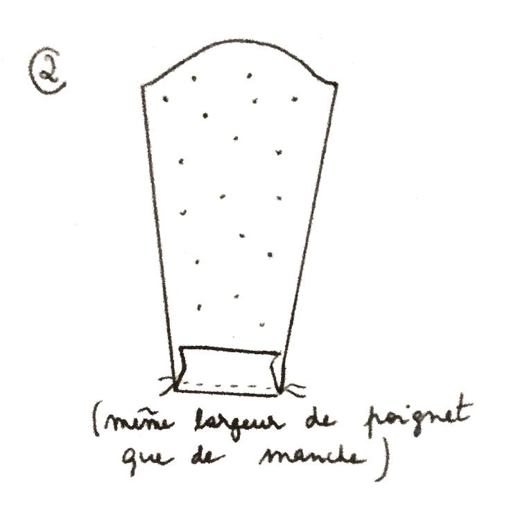 - Si la manche est plus large que le poignet: des fronces/plis pourront être réalisés en bas des manches pour obtenir la même largeur