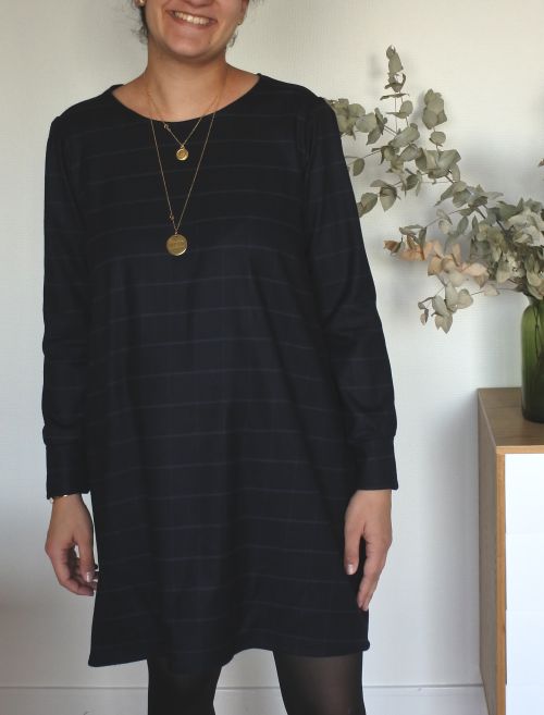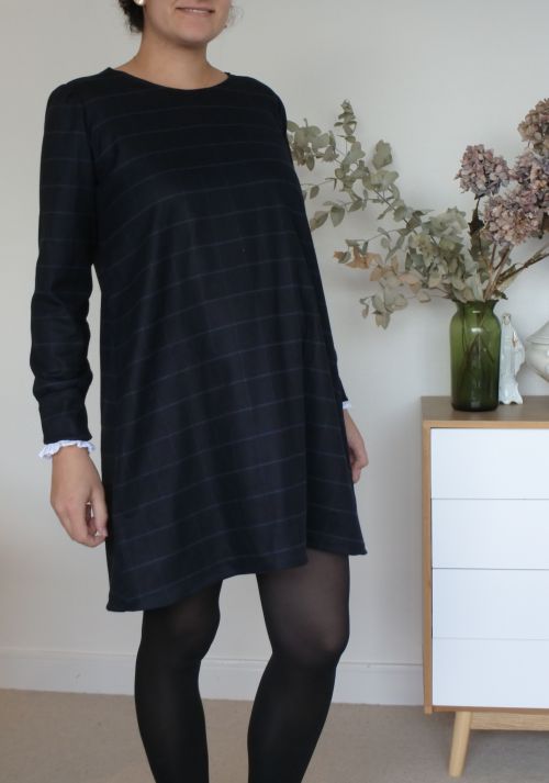 ](/uploads/2018/12/sixt7.jpg) Après la naissance de Constance, reprise de la couture tout en douceur avec un modèle que je commence à connaitre par coeur: la robe Sixtine ! Réalisée dans cette flanelle trouvée au Chat sur un Fil lors du CSF, j’ai choisi cette fois-ci de ne pas réaliser le col montant. A la place, j’ai creusé un peu l’encolure et conservé le noeud dans le dos, en passant une grande bande dans 2 entailles de boutonnières. Pour les finitions de ce col, j’ai préféré opter pour du biais plutôt que réaliser une parementure (plus rapide et facile!). Rien de plus à signaler sur Sixtine (vous trouverez une revue plus précise ici) si ce n’est la longueur des manches que je suis toujours obligée d’allonger! Quant à la flanelle, elle remplit bien sa promesse : douce, chaude, ne peluche pas et très facile à travailler! Un peu de minutie est seulement requise si l’on choisit de bien réaliser les raccords de carreaux! [