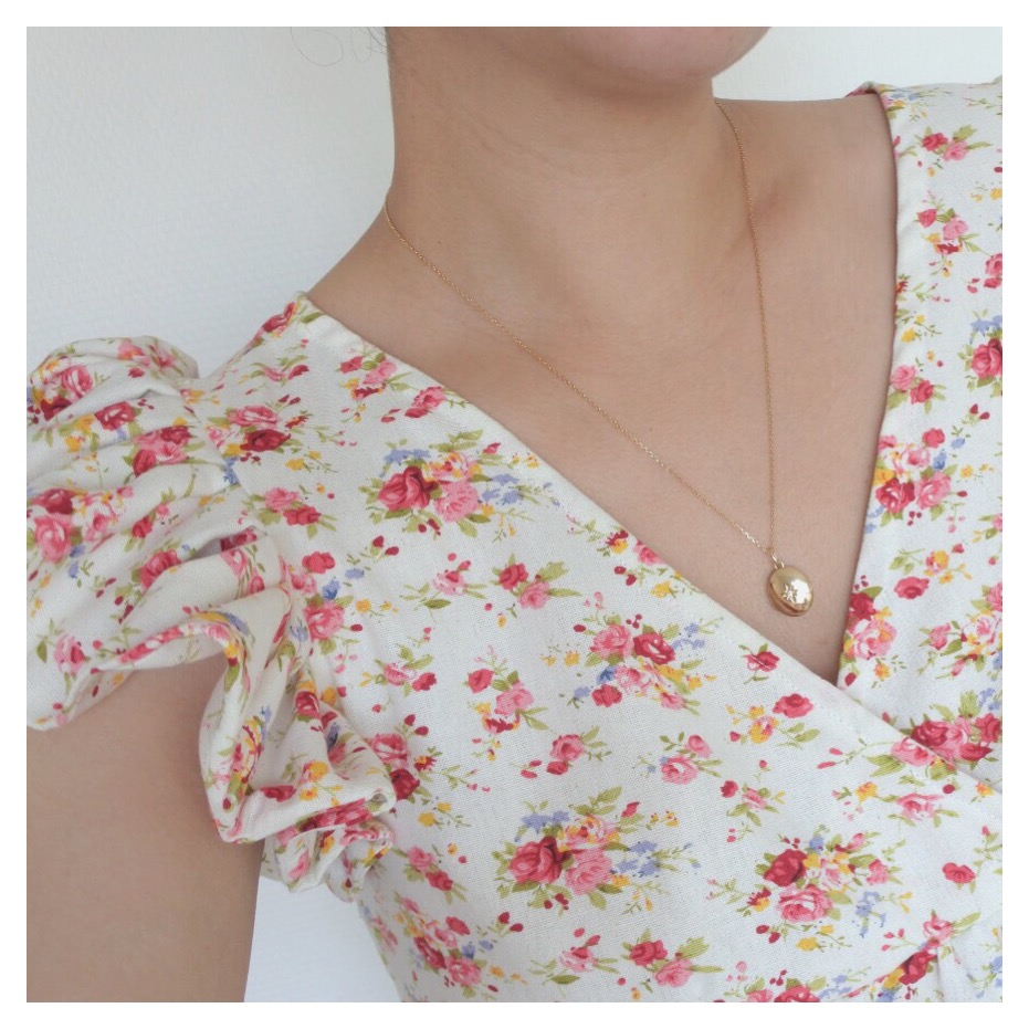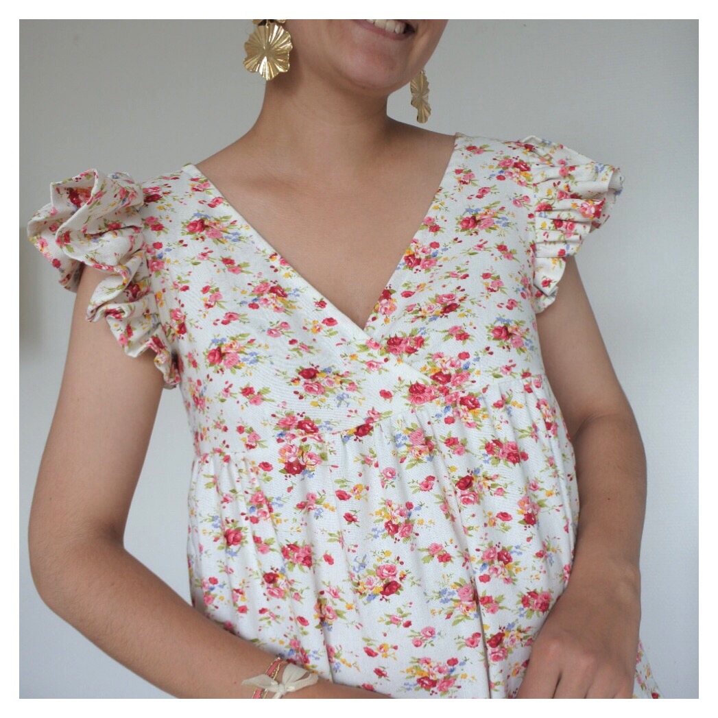 Le tissu Pour cet été, je l’ai voulue en motifs fleuris : rien de mieux que le fameux lin viscose champêtre des Coupons de Saint-Pierre, maintes fois en rupture de stock et réassorti à plusieurs reprises (je ne le vois plus sur le site en version “fond blanc”…mais il y a toujours la version “fond gris” qui est très jolie aussi) ! Je suis très sensible aux questions de transparence: j’avais un petit doute sur la question de doubler ce lin viscose ou pas. Finalement avec les fronces, objectivement, la robe ne nécessite pas de doublure et cela m’a bien arrangée ! En effet, ce coupon est assez épais et lourd, cela m’ennuyait de l’alourdir de nouveau avec une potentielle doublure ! Attention à bien le laver avant usage car il a tendance à légèrement se rétracter et donc rétrécir ! Le patron Je vous avais déjà partagé mon expérience avec ce patron Eugénie (ici et ici). Comme pour la précédente version robe, j’ai repris la largeur de la robe, en la diminuant de quelques cm sur les côtés, de chaque rectangle qui forme le bas ! Les manches J’ai opté pour des manches à volants, dont vous trouverez le super tuto de Made in Estelle ci-dessous. Ce mix fonctionne bien avec la robe, ce détail est original et facile à réaliser !