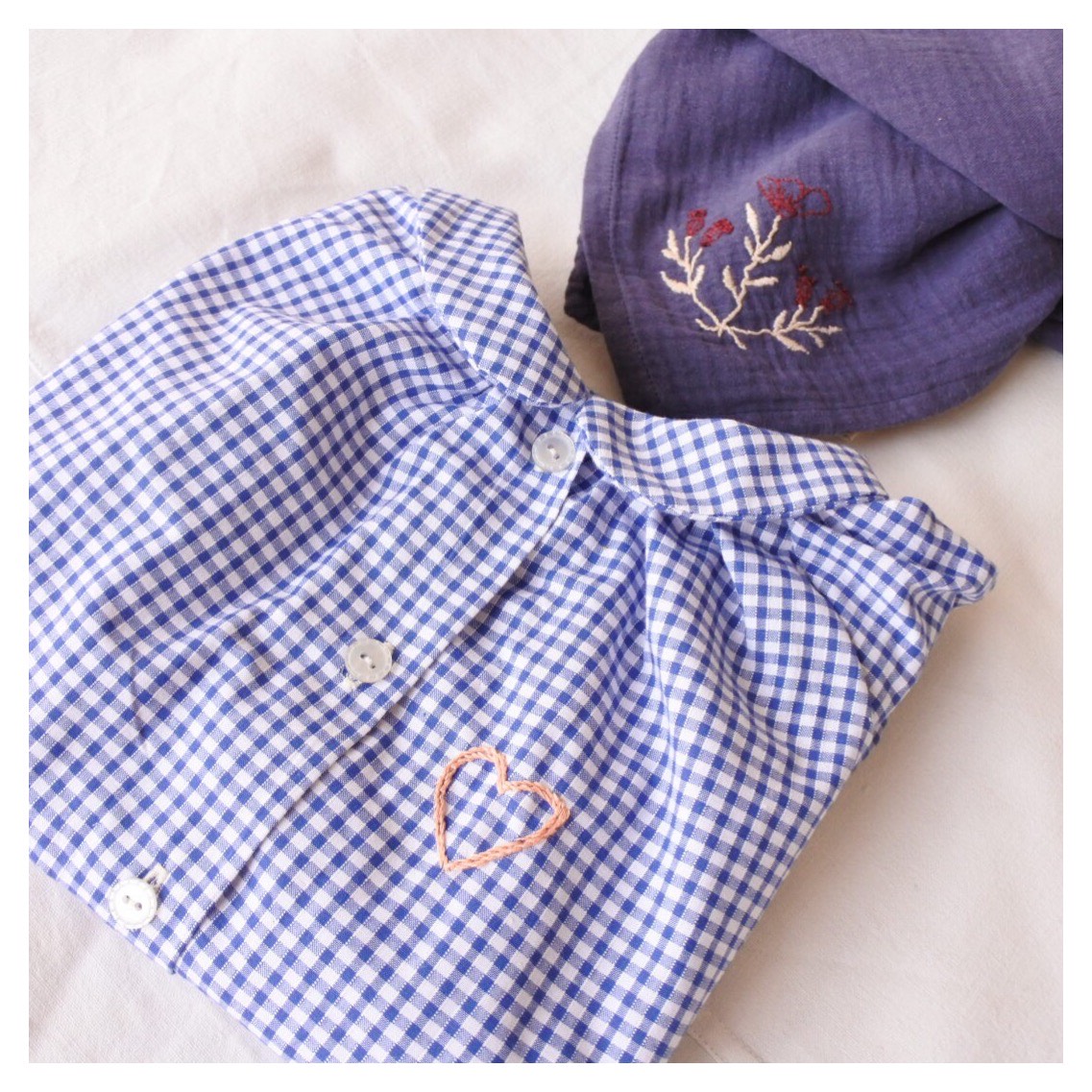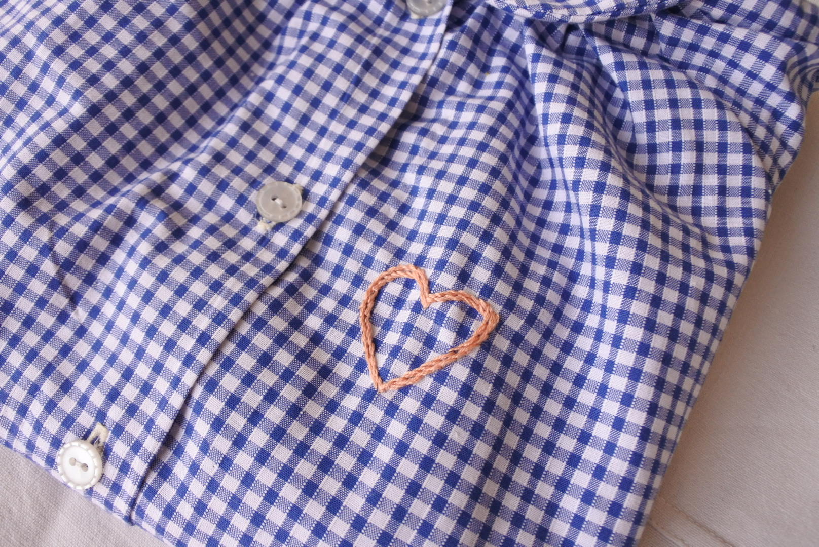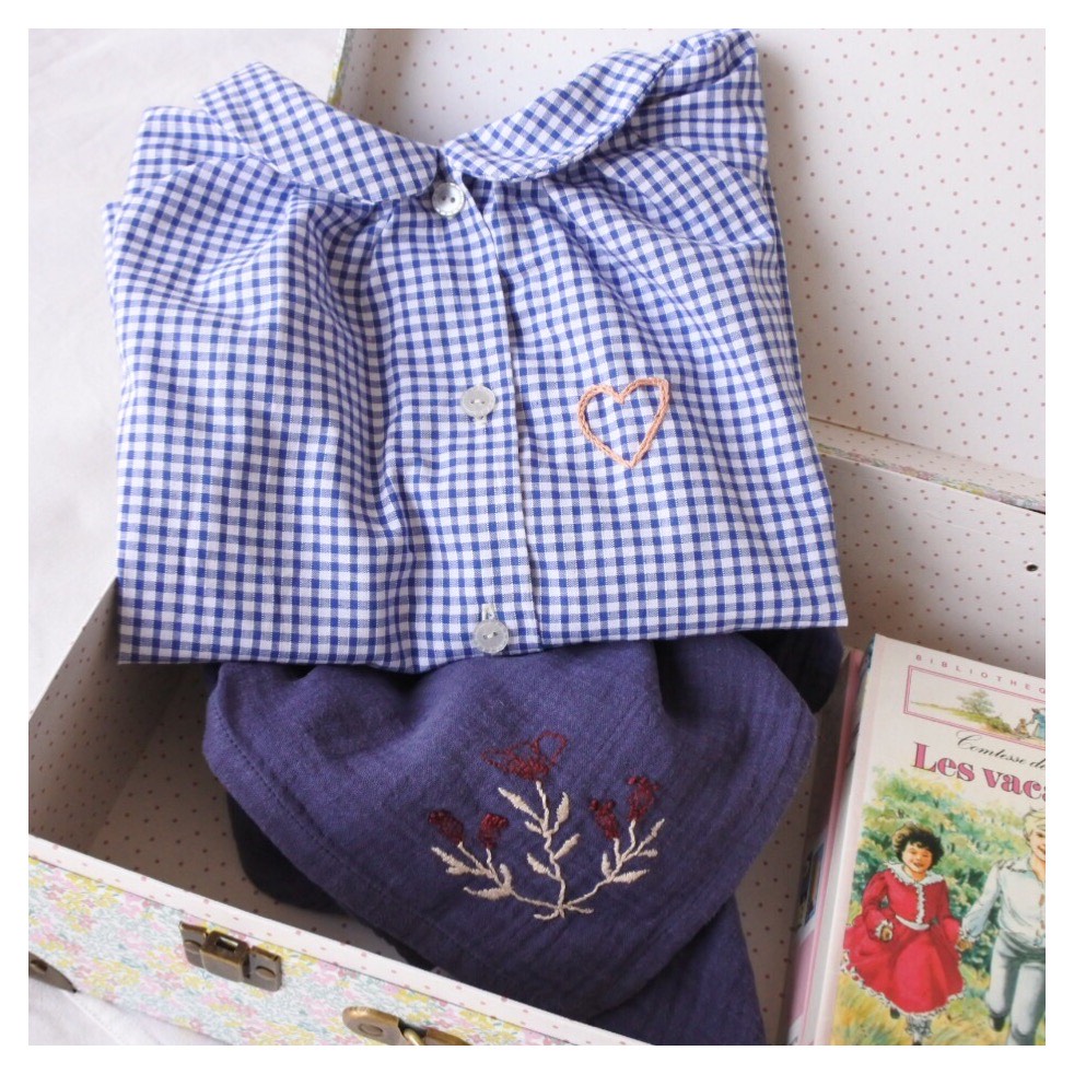 Le patron Odette de Citronille J’ai déjà eu l’occasion de décrire ce patron (ici), et je confirme que cette pièce est un modèle très agréable et accessible! Les difficultés résident seulement dans les fronces au col, à bien répartir entre les différents repères. J’ai également investi dans un pied à boutonnière Singer, très basique mais qui m’aide grandement pour obtenir de jolis finitions! Par rapport aux précédents modèles, j’ai également réalisé plus de couture à la main : la couture du pied de col et les points invisibles pour maintenir les rabats du devant. Finalement, ces points sont aussi solides que ceux d’une machine, et les finitions bien plus jolies. Joli coeur Je n’ai pas pu m’empêcher d’ajouter une petite touche de broderie pour orner Odette : j’ai simplement dessiné un coeur et réalisé un double rang de points de tige, un point très simple, qui change du point arrière avec un rendu plus doux!