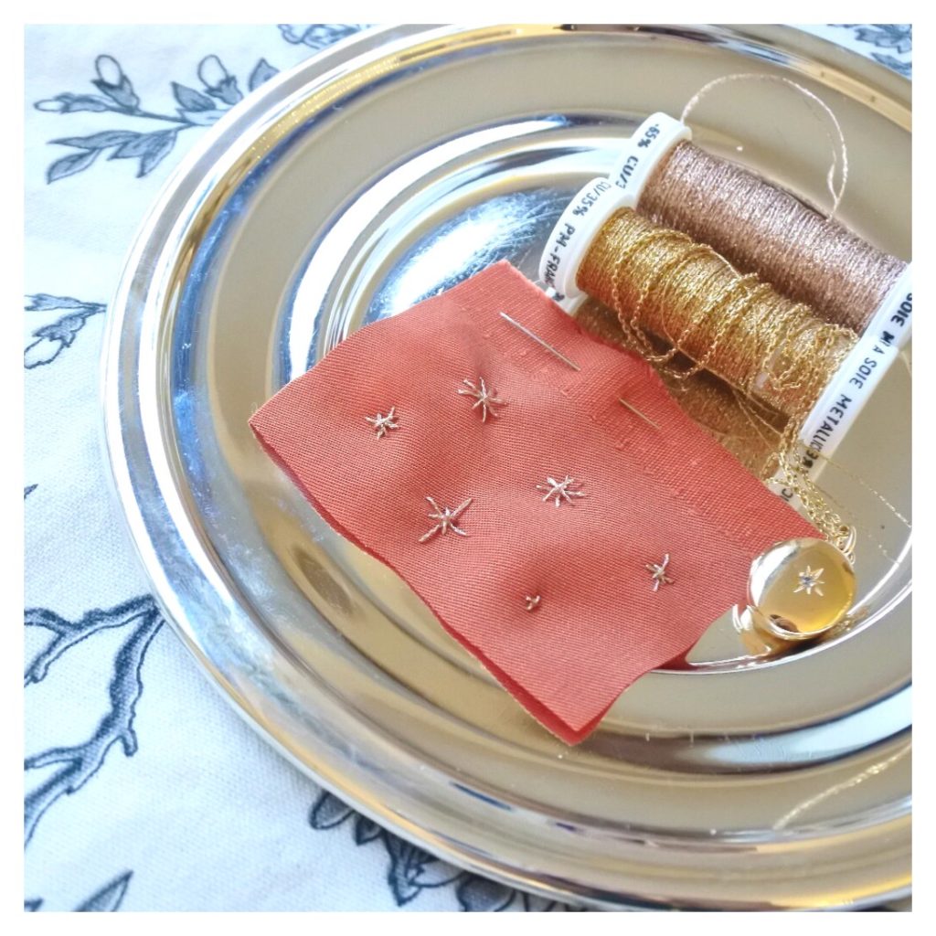 - Du fil : comme beaucoup, j’ai 2 marques chouchous ! DMC et ses fameux moulinés et la manufacture Au Ver à Soie dont la qualité des produits (les fils métallisés sont mes favoris) égale le savoir-faire traditionnel qui se transmet dans cette famille depuis 200 ans! Une fois ces magnifiques fils, moulinés et bobines à portée des yeux, il est très facile de se laisser emporter et de se retrouver avec des fils non utilisés, voire gâchés au début, ou de s’embrouiller en cherchant les bonnes associations de couleur alors que l’on débute juste! Pour commencer votre stock, je vous conseillerai donc de choisir 3 couleurs différentes, qui se marient bien ensemble et un fil métallisé, avec lequel vous pourrez rapidement jouer et qui ajoutera de l’éclat à vos ouvrages! Vos 3 couleurs doivent évidemment correspondre à vos goûts mais aussi aux pièces que vous souhaitez broder! Ainsi armée de vos 3 couleurs et de votre fil doré, vous obtiendrez un jeu de broderies assorties, qui ajouteront également de la cohérence au sein de votre garde-robe!