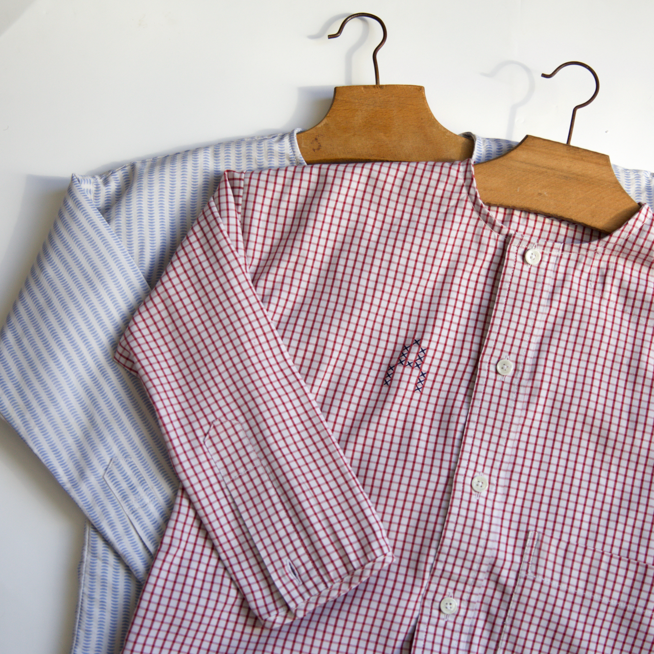 Chaque modèle possède ses petits détail : la forme des poches qui changent, la longueur des manches… Mais surtout une petite broderie sur deux des blouses ! Sur la version en vichy rouge, j’ai brodé une initiale avec notre alphabet au point de croix, et sur celle à carreaux bleu, un petit oiseau blanc de notre planche vintage “Les oiseaux”.