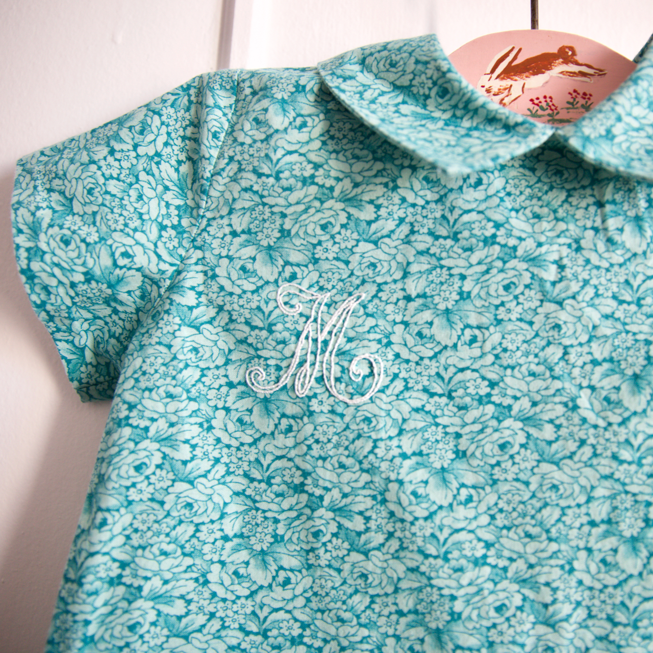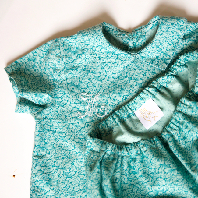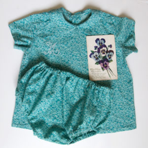 Si vous nous suivez depuis un moment, vous savez que nous aimons personnaliser nos cousettes en y ajoutant des petits détails ! Sur cette tenue, j’ai choisi de coudre des petits boutons nacrés de chez Emmaüs au dos du chemisier. J’ai également brodé une initiale sur le devant. C’est un modèle que vous pourrez retrouver bientôt sur la boutique ! Et bien sûr, le bloomer a eu droit à sa petite étiquette. Il s’agit ici du modèle “main dans la main”, que j’ai cousu à l’intérieur pour rendre l’habillage plus rapide et plus poétique. Vous pouvez le retrouver ici.