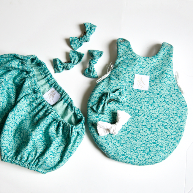 Ne voulant par perdre une miette de ce joli tissu, j’ai coupé dedans plusieurs petits projets : - Une turbulette Martine, tirée de notre collection de patrons pour les poupées, sur laquelle j’ai cousu une de nos étiquettes.